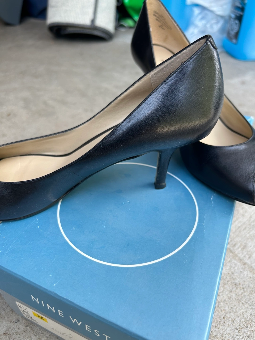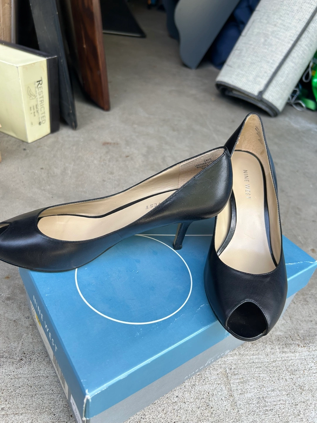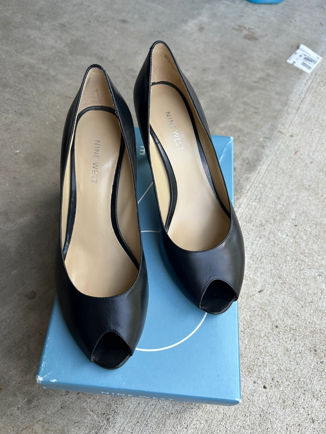 These Nine West peep-toe heels are a classic addition to any wardrobe! They're in great shape and come in their original box. The size is 7, perfect for a night out or a professional look. These heels are black leather and are very comfortable.