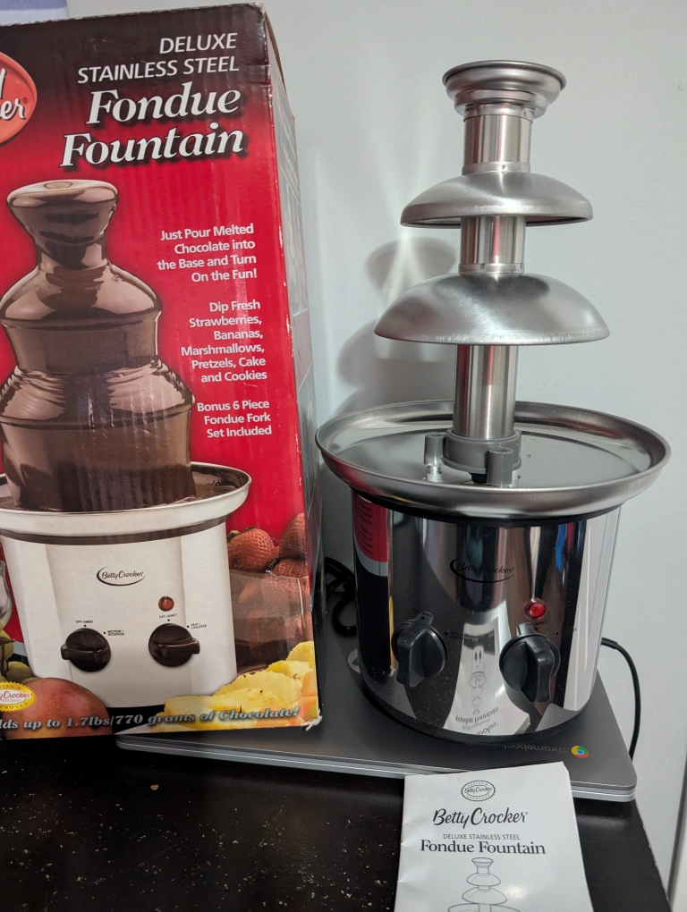 Get ready to have some fun with this Betty Crocker Deluxe Stainless Steel Fondue Fountain! It's perfect for dipping fresh strawberries, bananas, marshmallows, pretzels, cake, and cookies. The box mentions it holds up to 1.7lbs/770 grams of chocolate .
