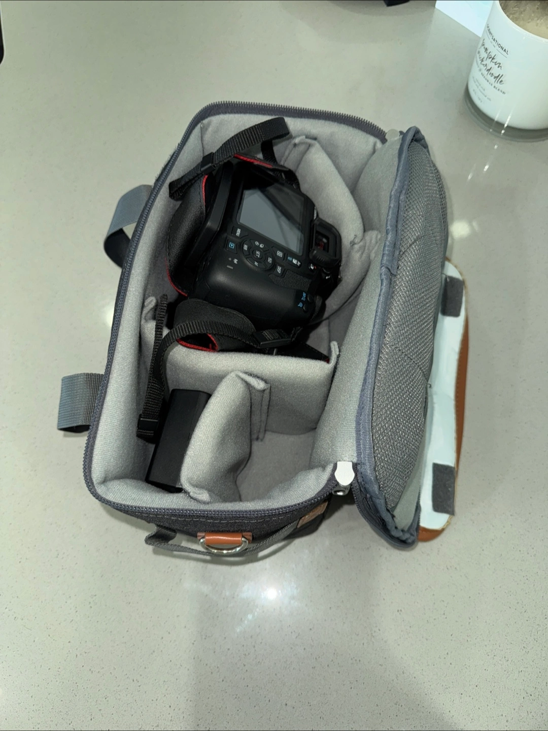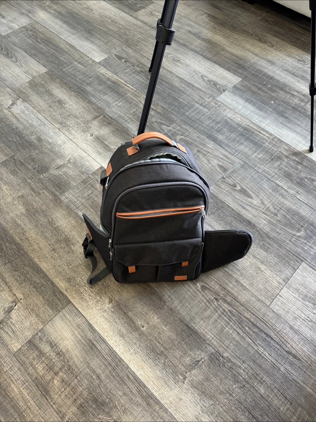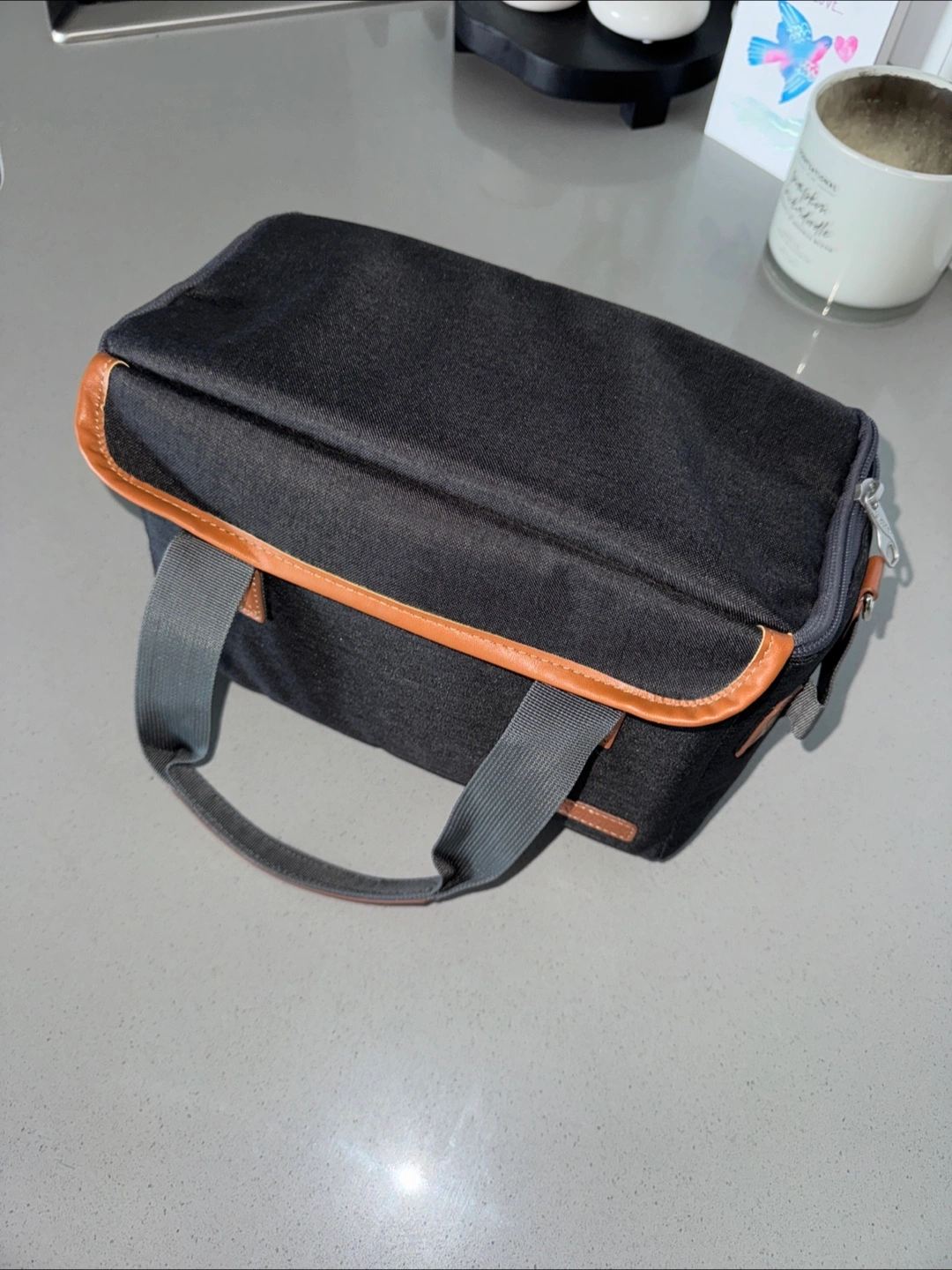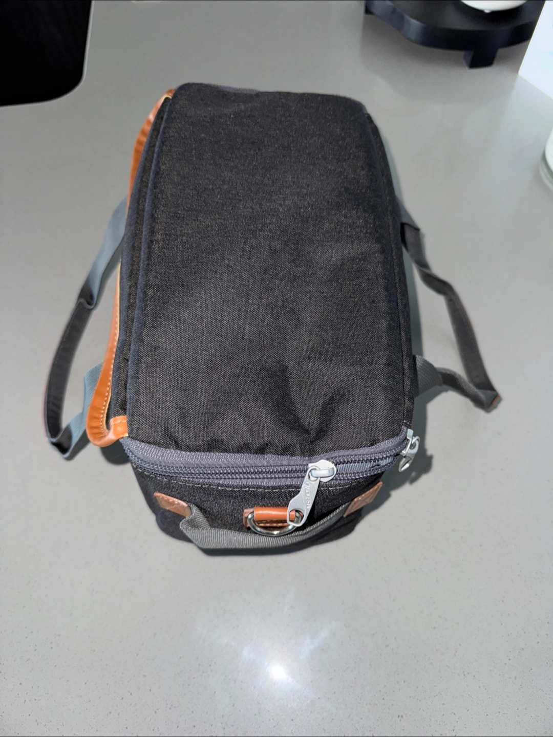 Selling a camera bag in great condition! It's black with brown trim and grey straps. Perfect for carrying your camera and accessories safely and securely. It has adjustable dividers inside to customize the space to fit your gear