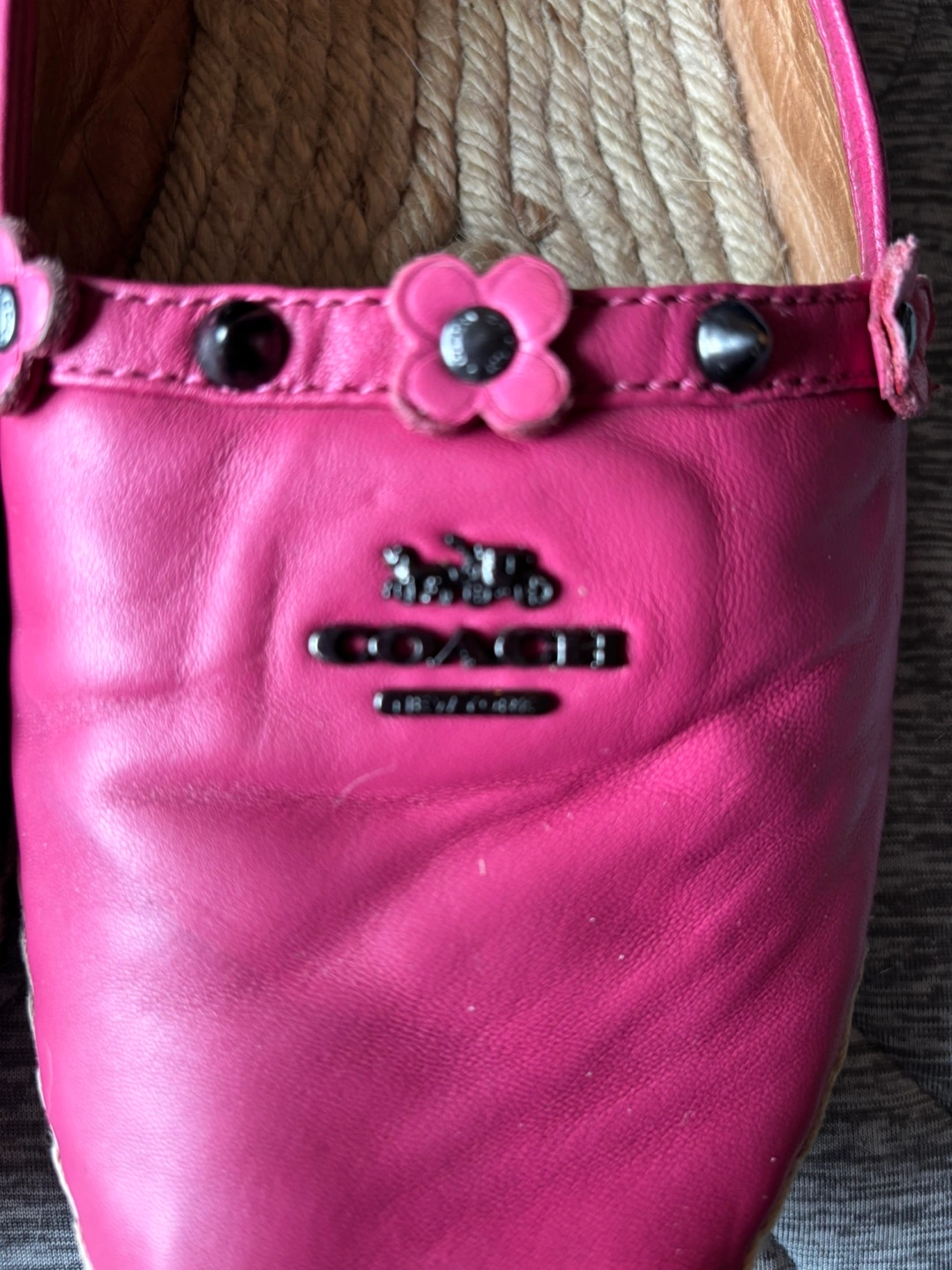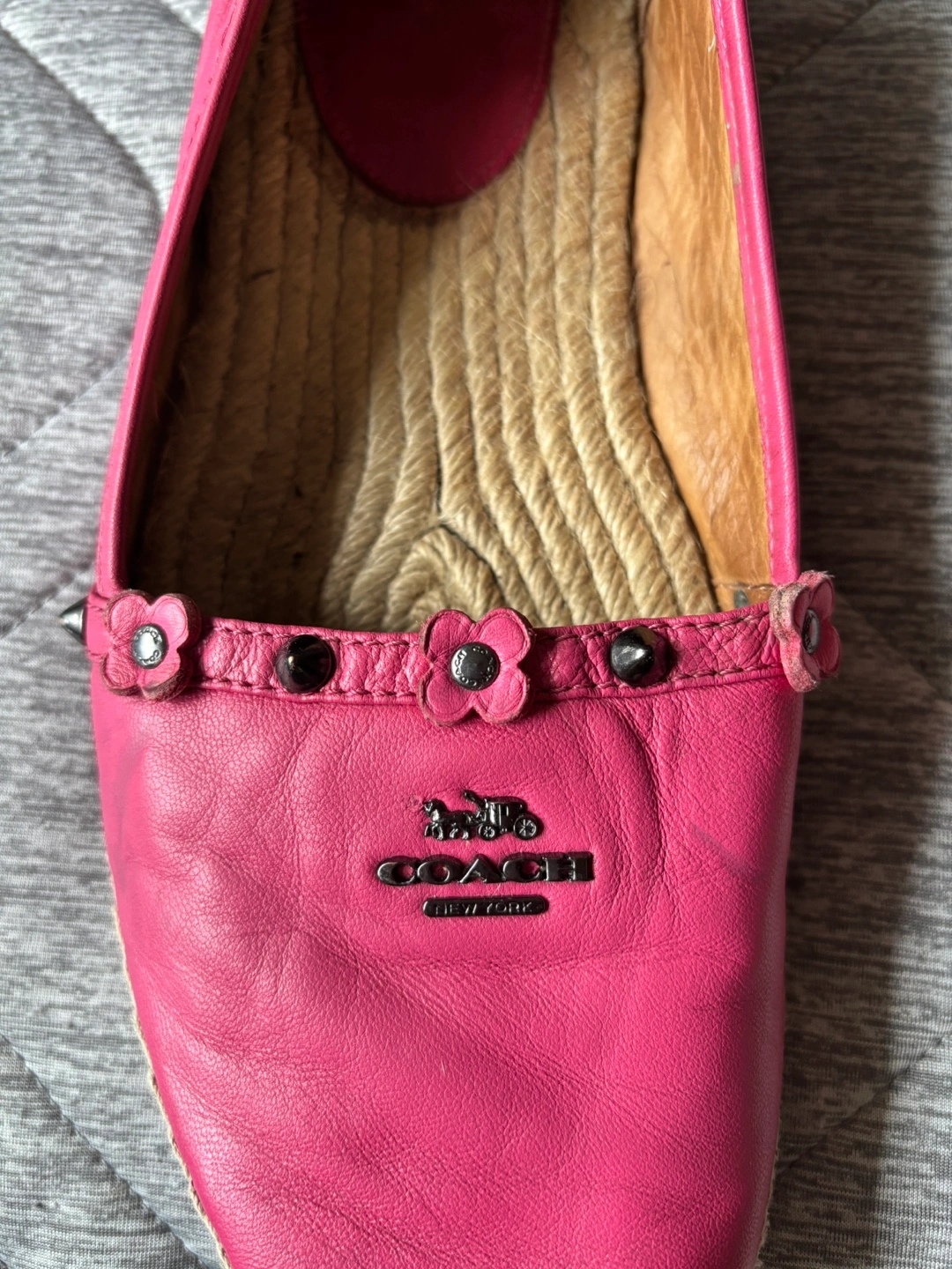 These are a cute pair of Coach espadrille flats in a vibrant pink leather. They feature a flower and stud embellishment along the toe. The soles show some wear and some scuff marks as shown in the last two picture but they still have lots of life left! Cash only.