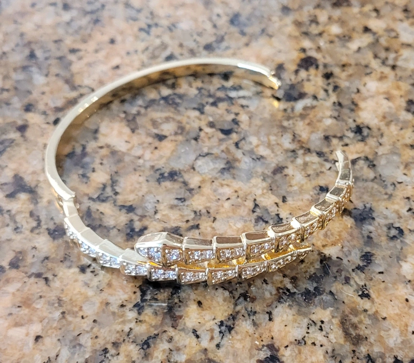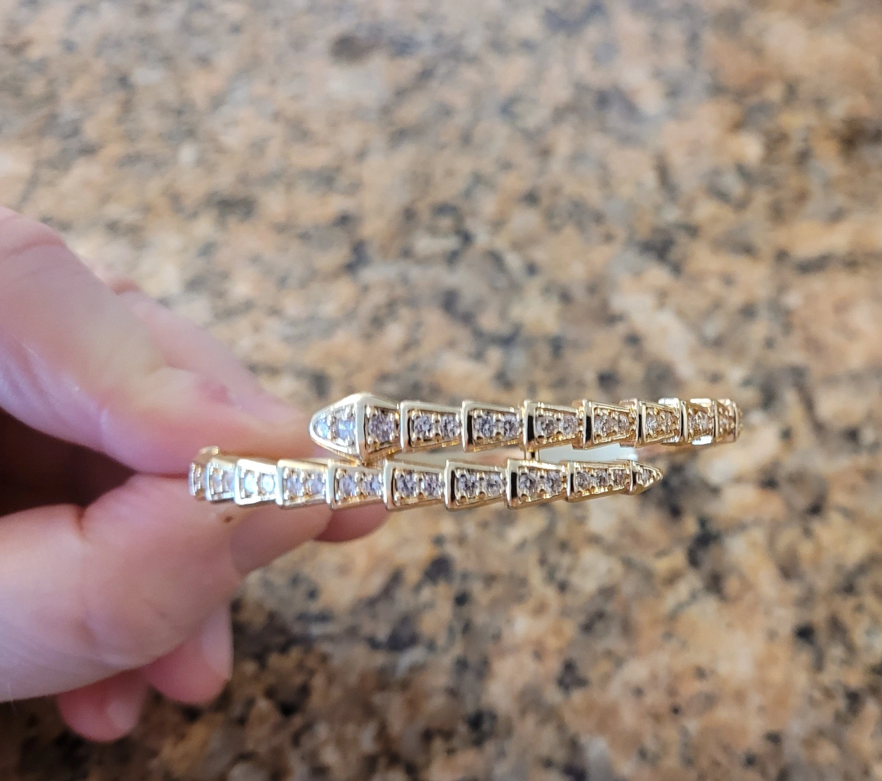 Selling a stylish gold-tone snake bracelet. It features a unique design with rhinestones that add a touch of sparkle. Brand new condition and ready to be worn! $20 each!