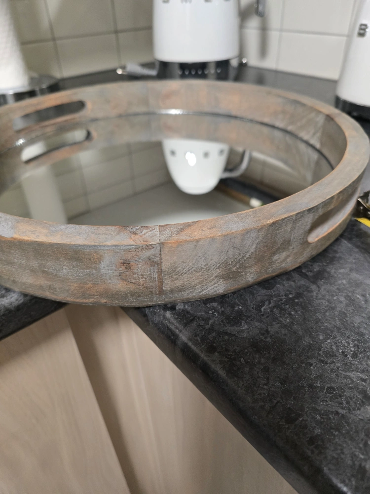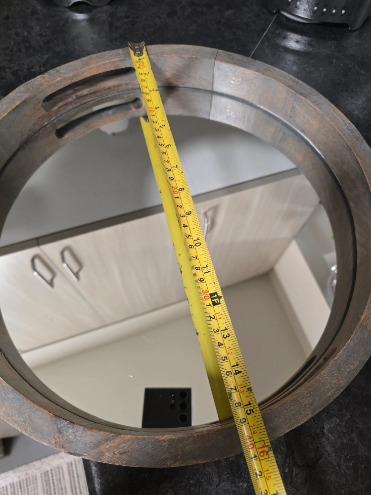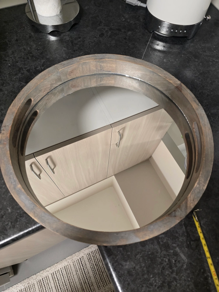 Selling a round wooden mirror tray with handles. It's in great condition and would be a lovely addition to any home. The tray measures approximately 17 inches in diameter. pick up only Cash only see my other posts