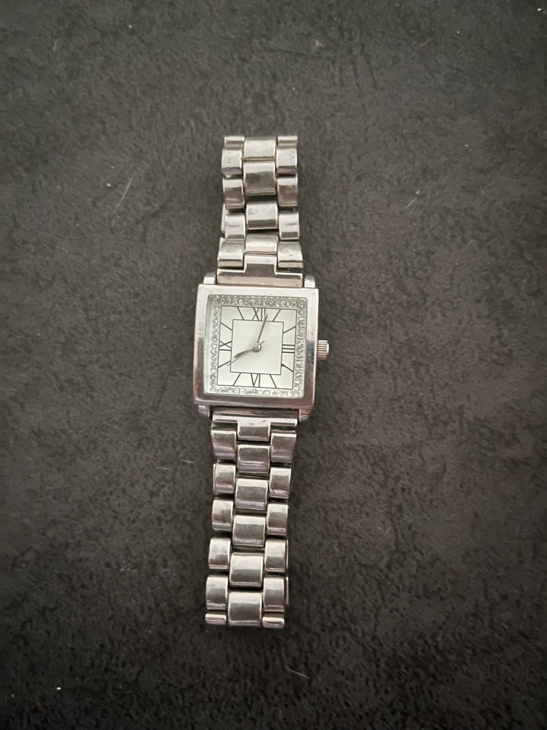 Selling a ladies' watch with a silver-tone finish. It has a square face with Roman numerals and a linked bracelet style band. The watch face is surrounded by small clear stones for a bit of sparkle. It's in good condition and ready to wear!