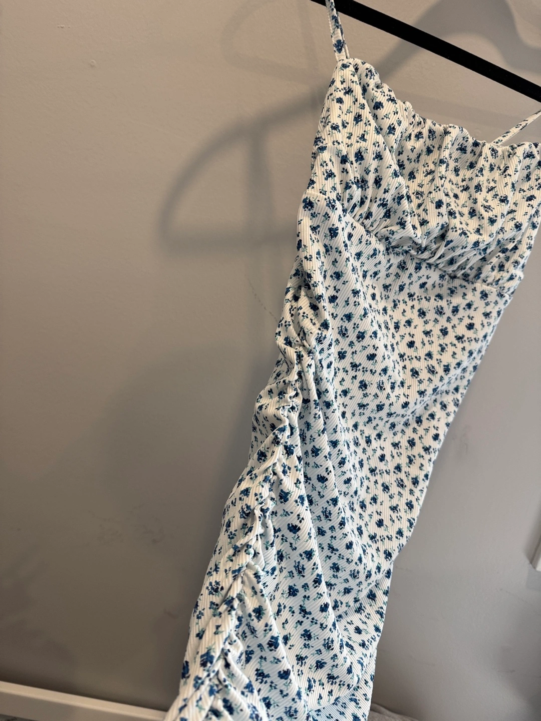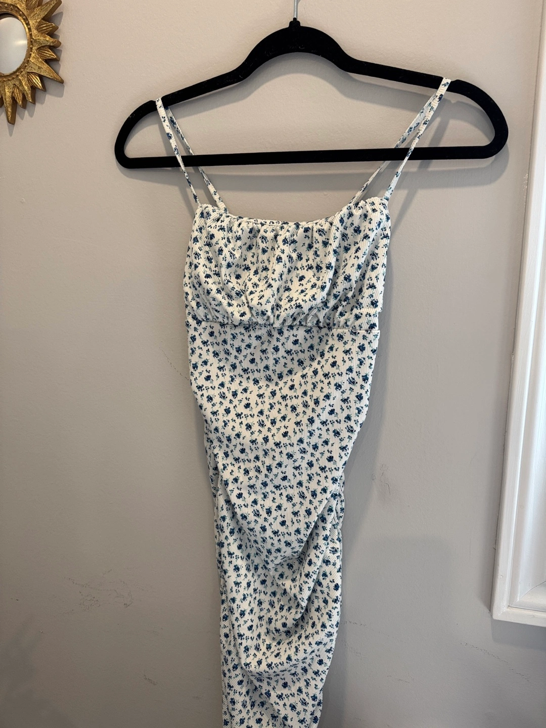 A cute mini dress with a floral print! It's in great condition and ready for a new home. The dress features a flattering ruched design.