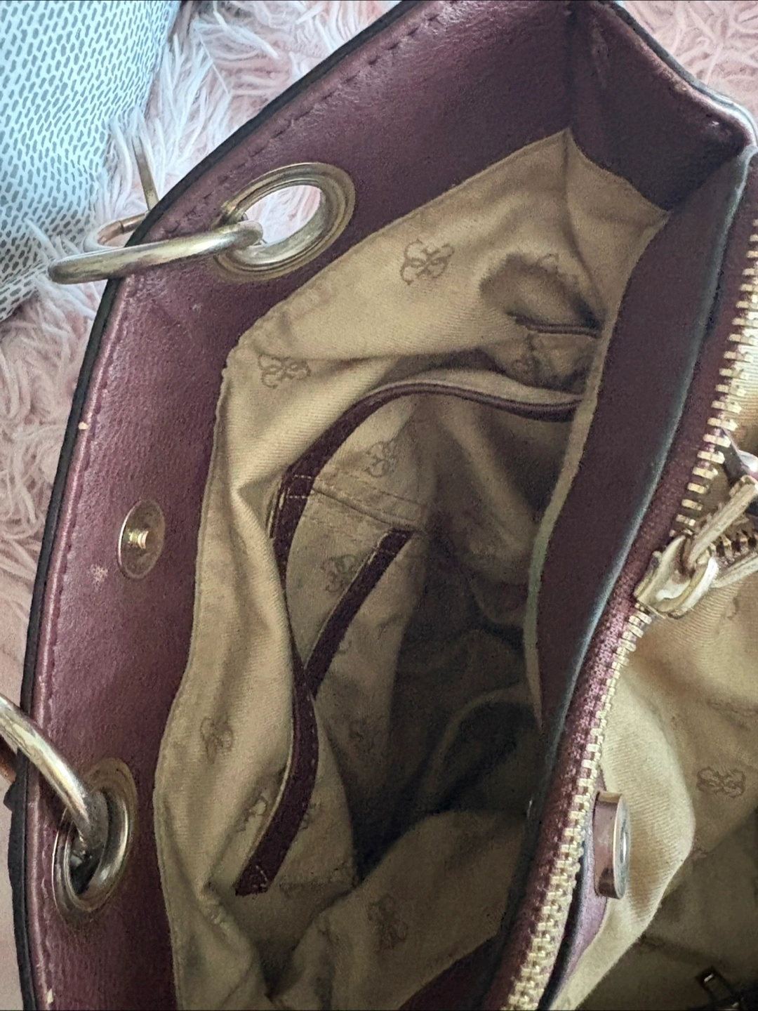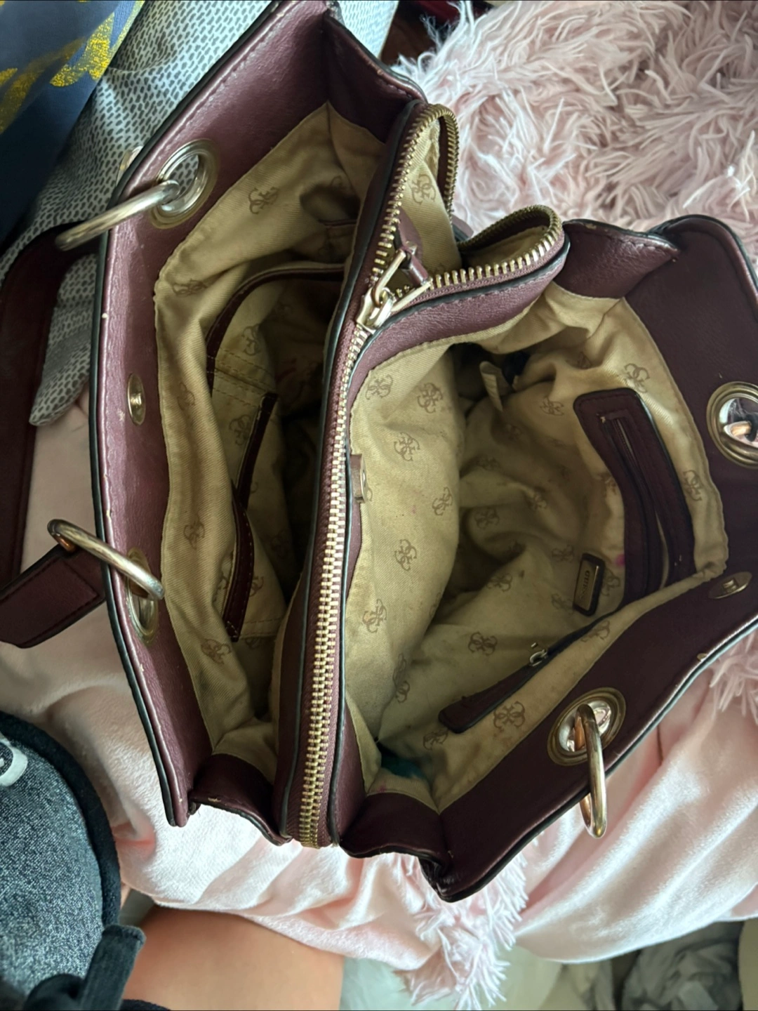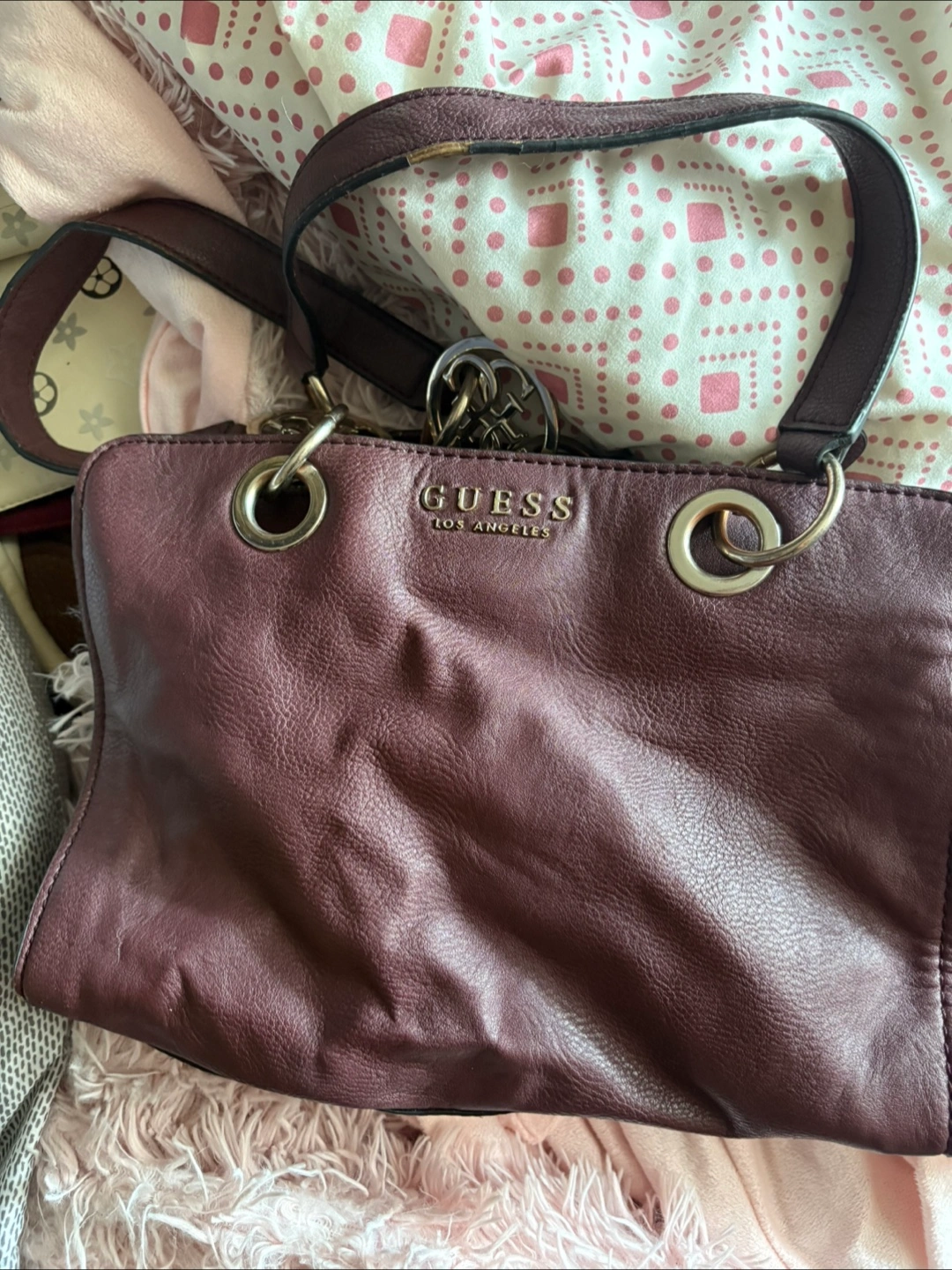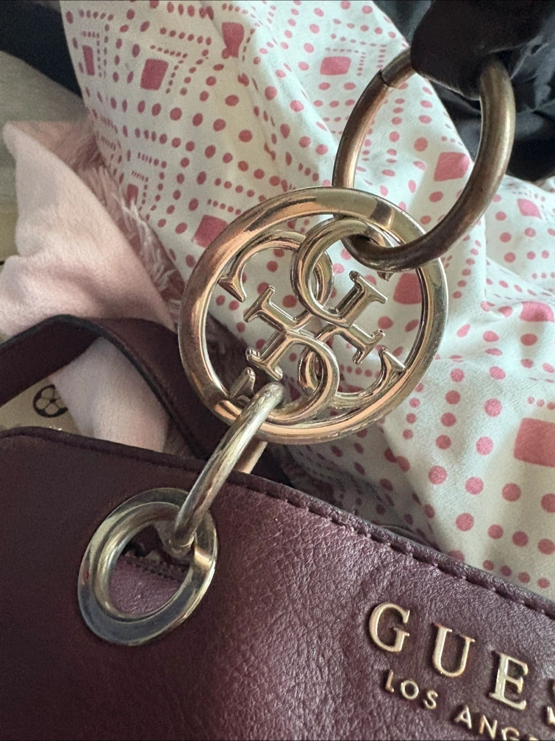 A lovely Guess purse in a rich purple colour! It's got some unique zipper and ring details, and the Guess logo adds a nice touch. It's a stylish everyday bag!