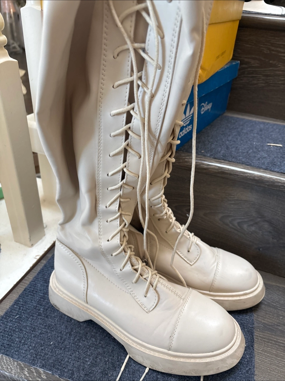 These are a pair of stylish beige knee-high boots with lace-up detailing. They show some signs of wear, but are still in good condition for everyday wear. They would look great with so many outfits!