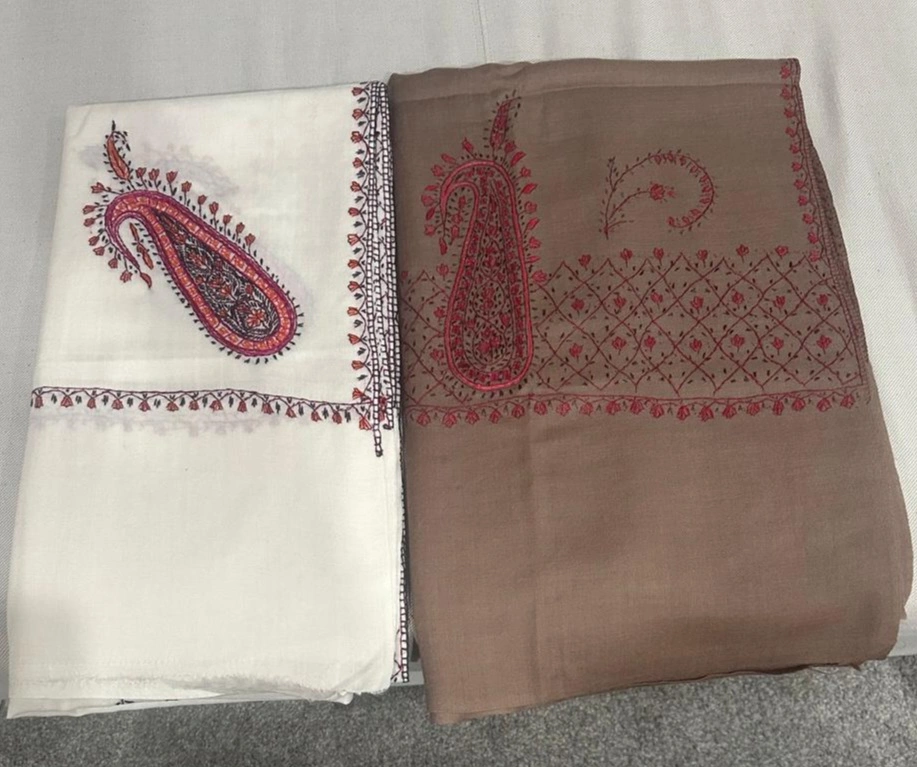 Selling two beautiful embroidered shawls. One is a lovely cream colour, and the other is a warm brown. Both feature intricate paisley designs with red embroidery. They're in great condition and would make a stylish addition to any wardrobe!