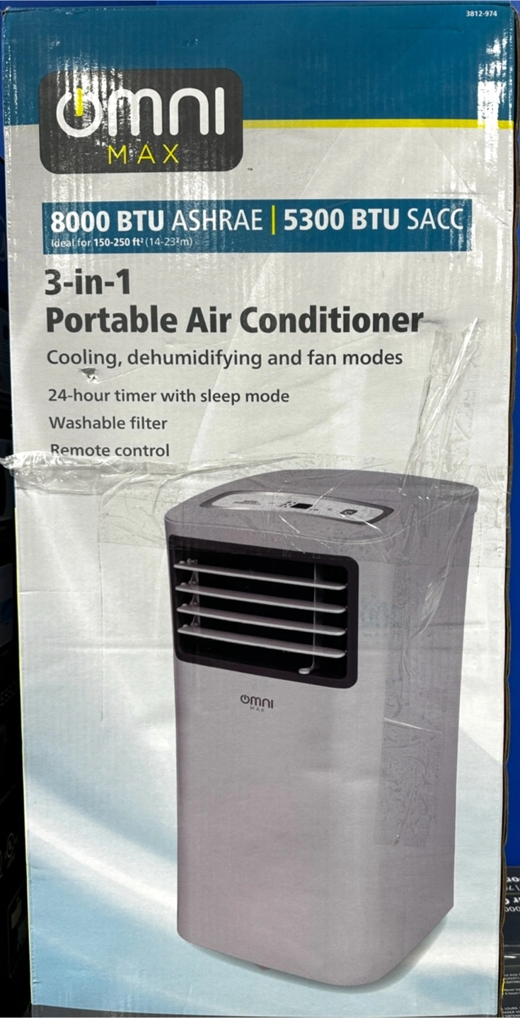 Selling an Omni Max 3-in-1 portable air conditioner! It has cooling, dehumidifying, and fan modes. Also features a 24-hour timer with sleep mode, a washable filter, and a remote control. Perfect for spaces 150-250 sq ft