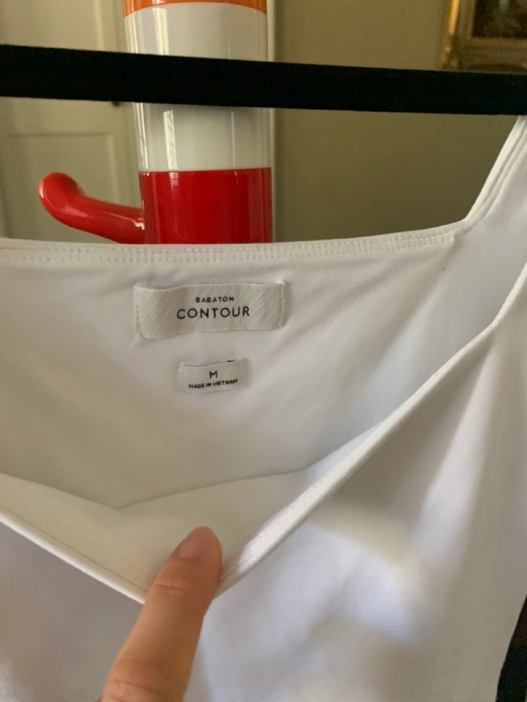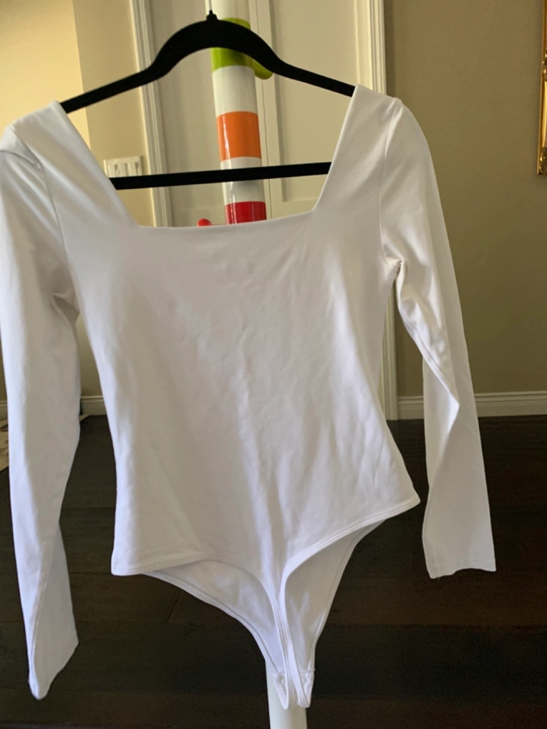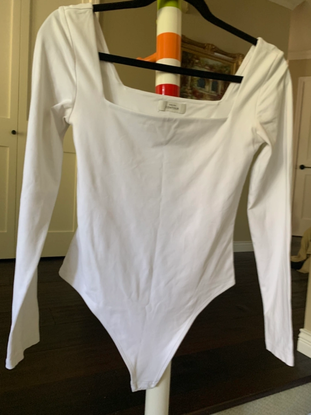 This is a white, long-sleeve bodysuit from Babaton's Contour line. It's a size medium and in great condition. Perfect for layering or wearing on its own!