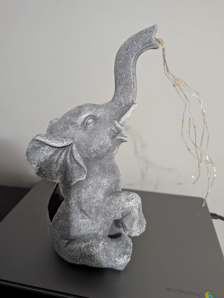 This is a charming elephant figurine, perfect for adding a touch of whimsy to any room. It features delicate fairy lights that add a warm and inviting glow. The figurine is in great condition and ready to find a new home!