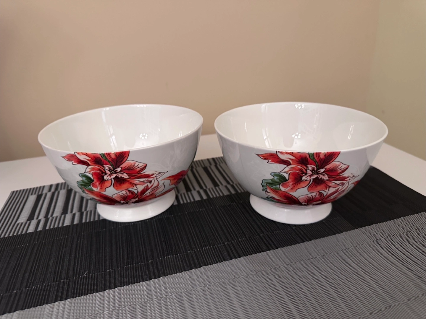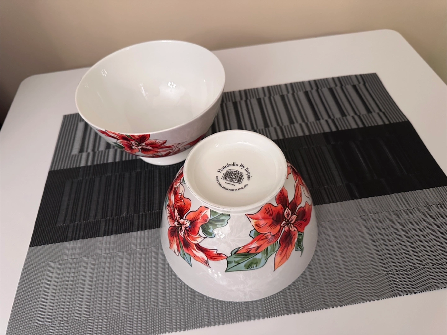 Here are two lovely Portobello by Design bowls, perfect for adding a touch of elegance to your table! They feature a beautiful floral design and are in great condition. The diameter of each bowl is approximately 14 cm.