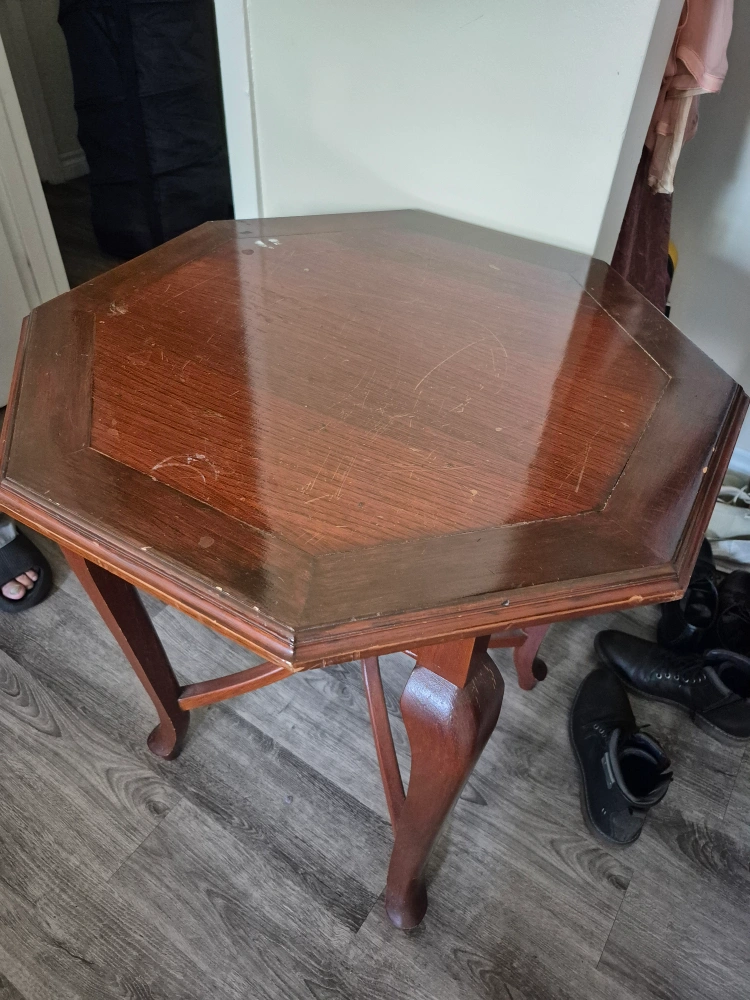 Selling a wooden octagon-shaped side table. It's a lovely piece with a unique design. It has some scratches and signs of use, but is still sturdy and functional. Perfect for adding a touch of vintage charm to any room!