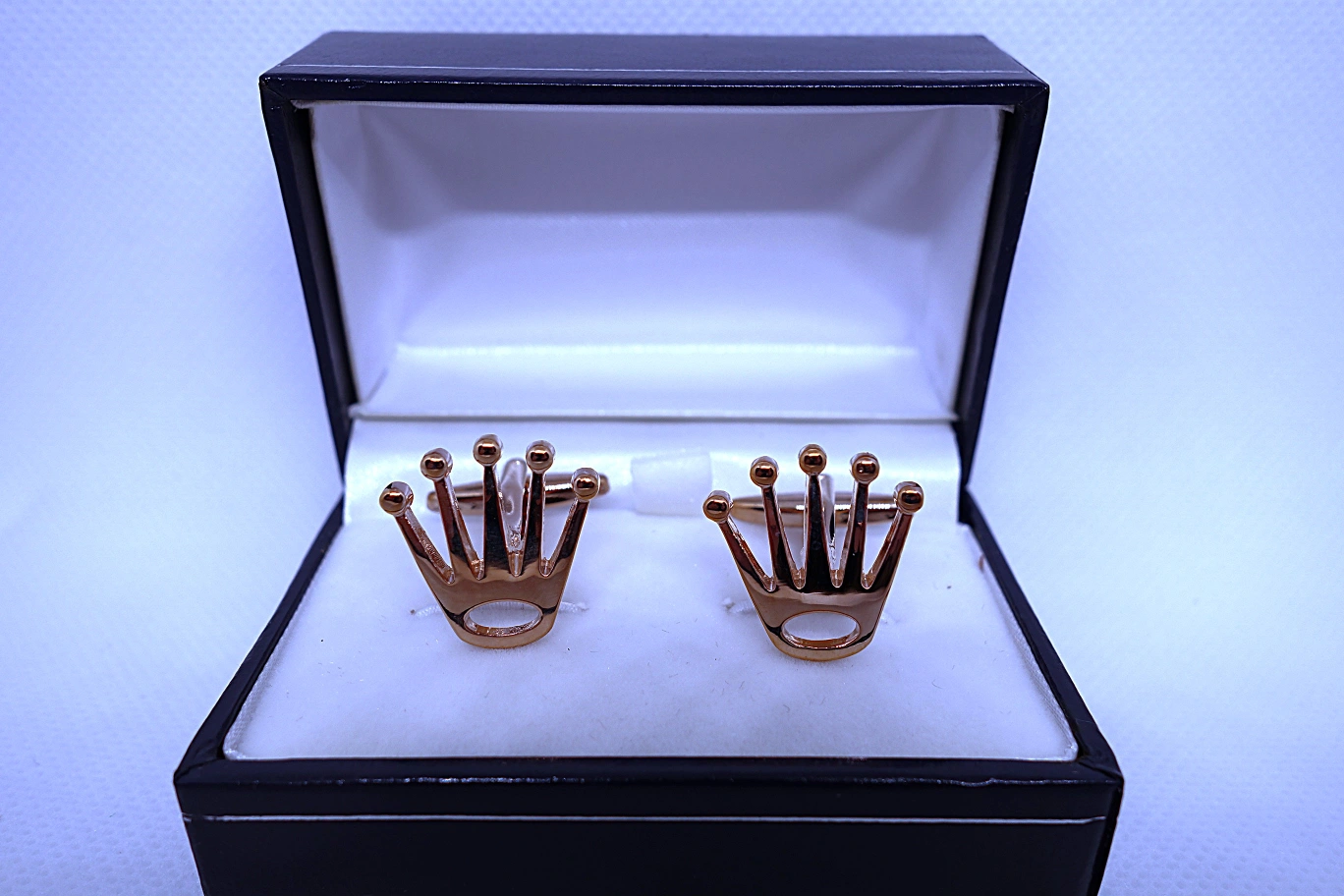 Selling a pair of Rolex crown cufflinks in rose gold. These cufflinks are in brand new condition and come with their original box. They add a touch of class to any outfit!