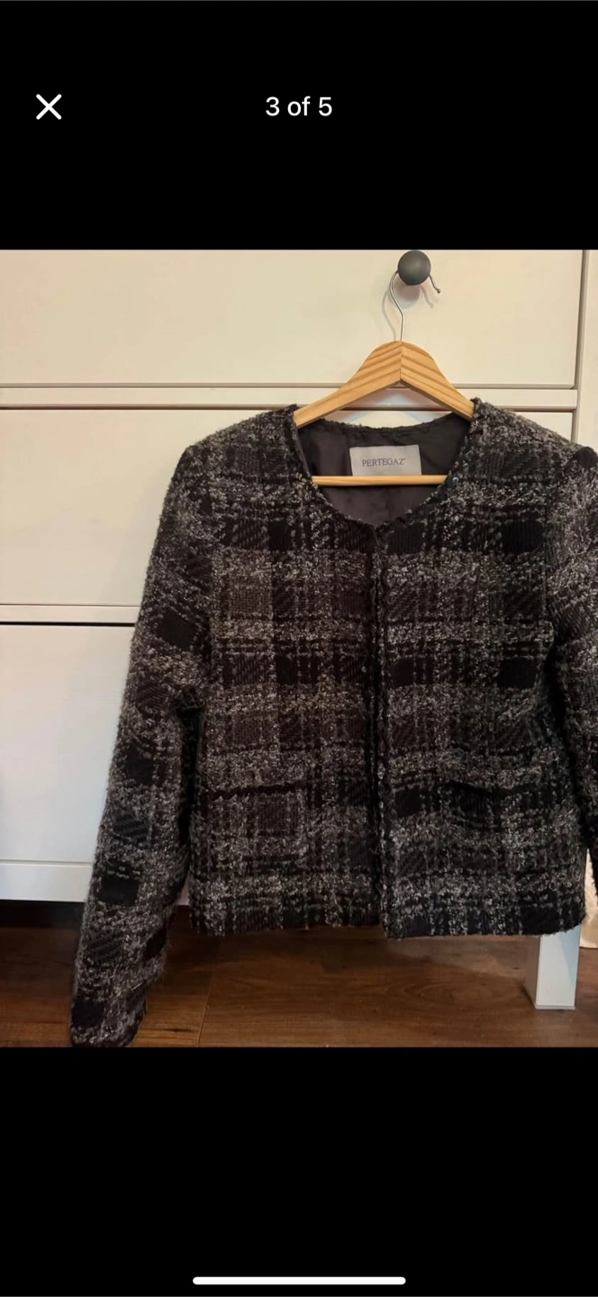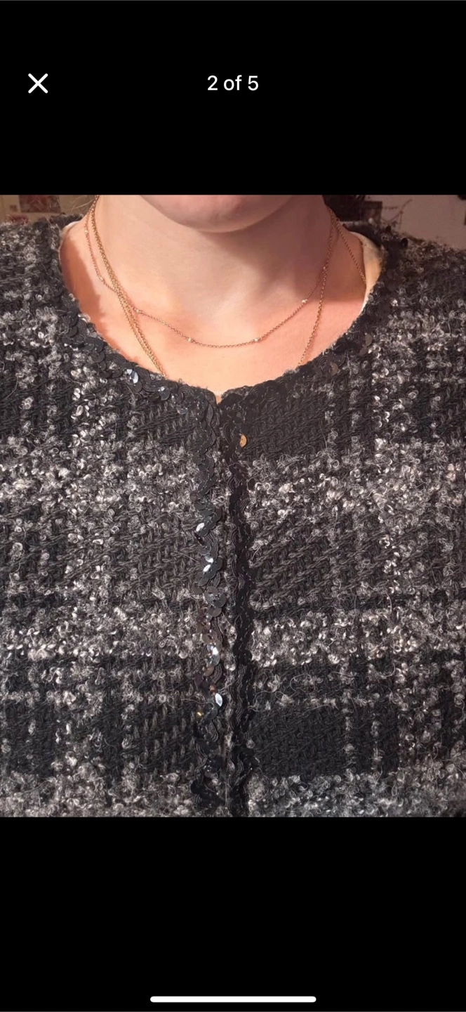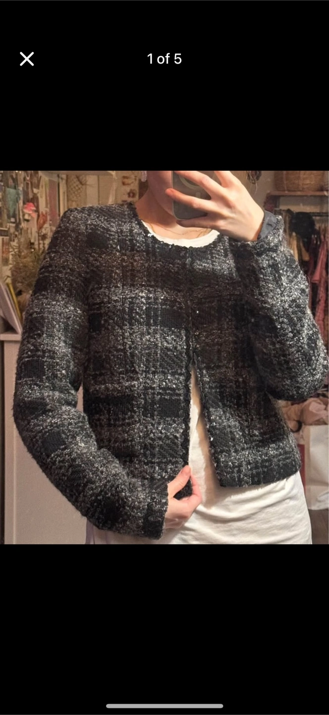 Cute & classy fully lined tweed black & gray jacket with black sequin detailing on collar, sleeves, and pockets. Can be worn fully closed with clasps or open. Brand: Pertegaz (from Mexico). Size 8 on tag but would fit a US size 4-6 best. I’m usually a size 4 — would not personally style with this top, I’m just showing how it looks on