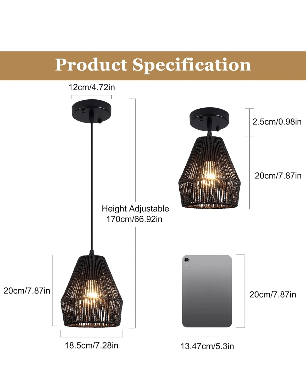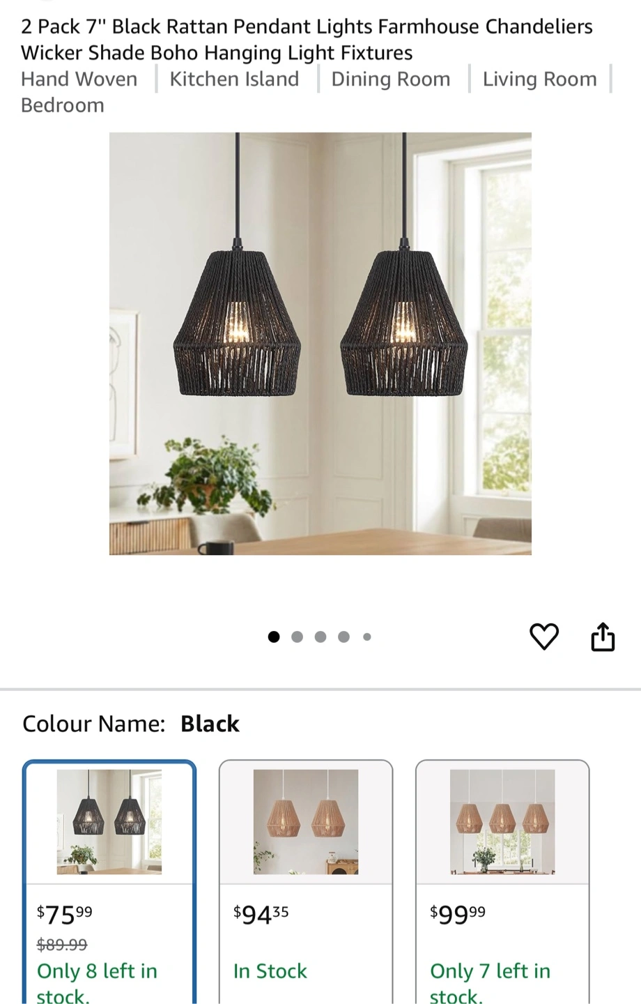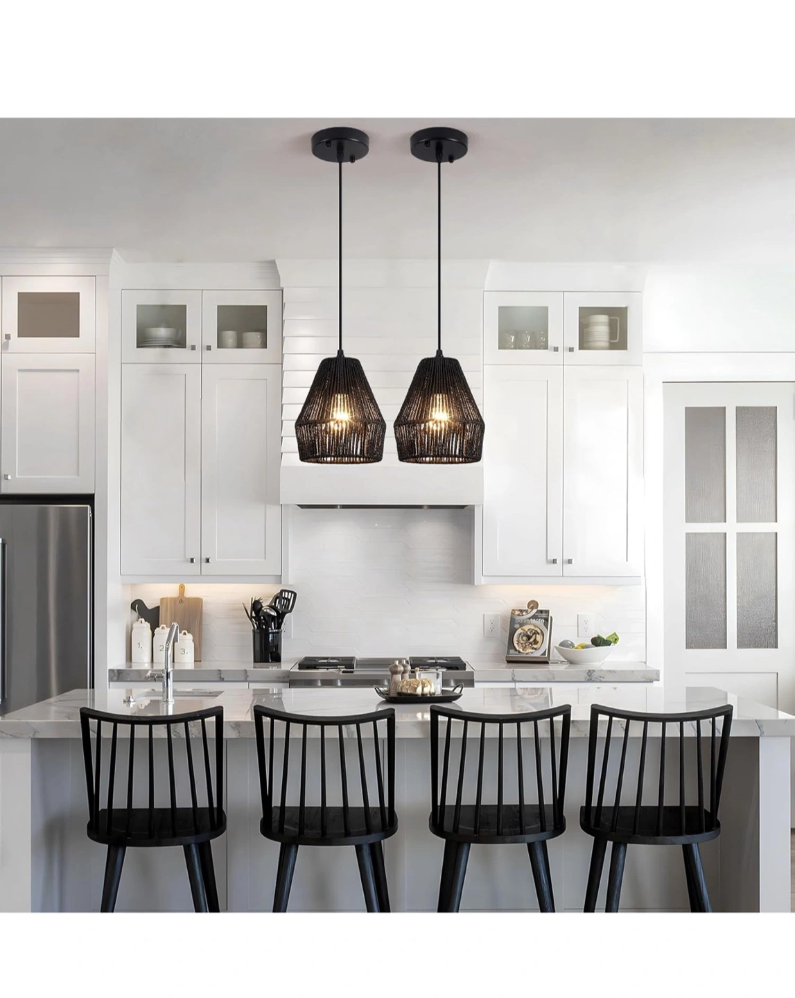 Selling a set of two black rattan pendant lights, perfect for adding a farmhouse or boho touch to your kitchen island, dining room, or living room! The shades are 7" wide and made of natural rattan. The height is adjustable up to 66.92 inches (170cm). Bulbs are not included, but they are compatible with all E26 bulbs
