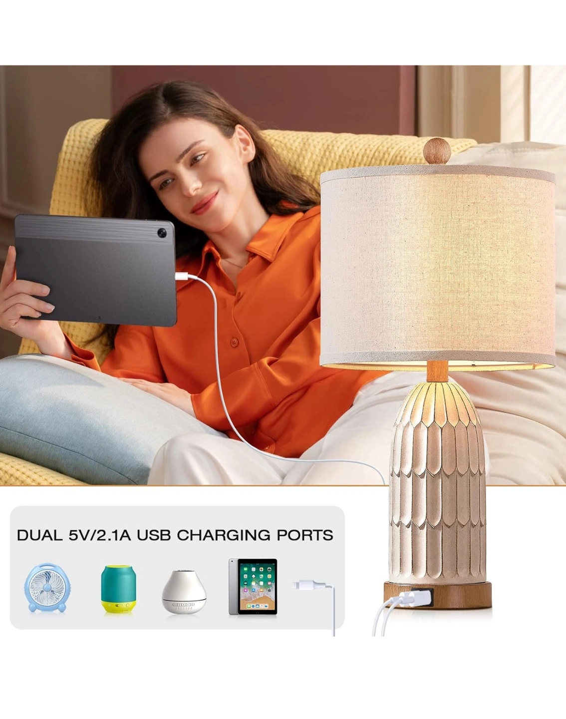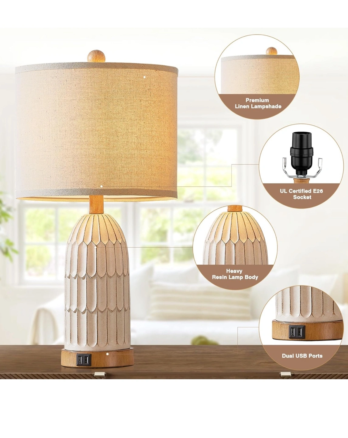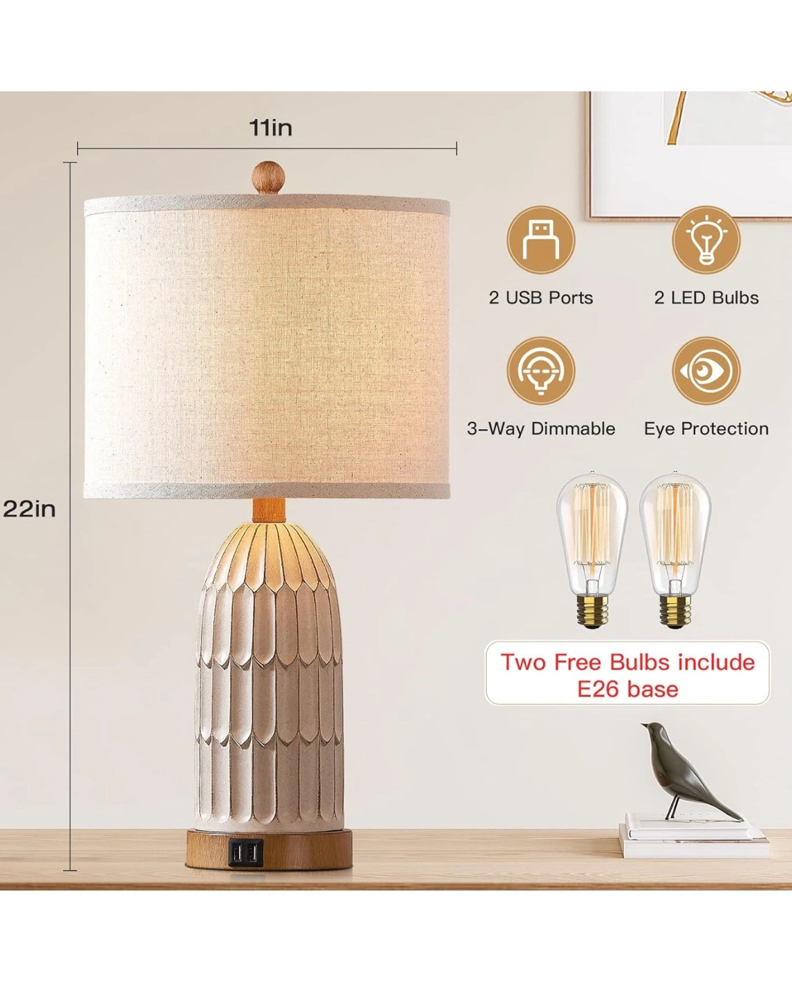 This table lamp is perfect for a bedroom or living room! It features: - Dual USB ports - 3-way dimmable touch control - Includes two free E26 base bulbs - Premium linen lampshade - Heavy resin lamp body It's 22 inches tall and 11 inches wide, perfect for a bedside table or end table