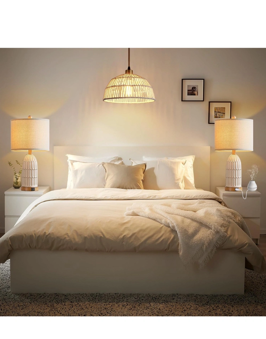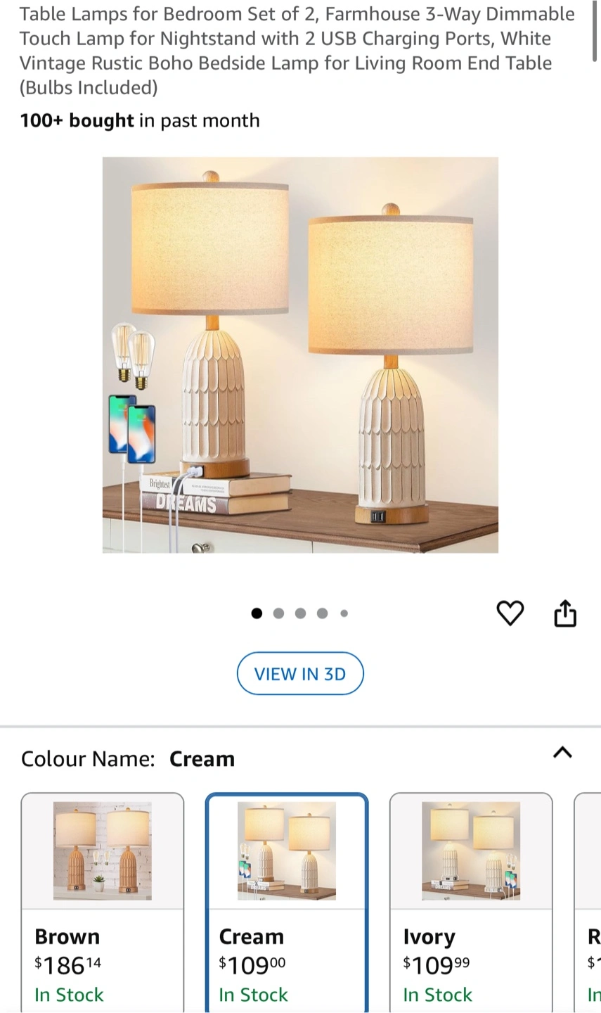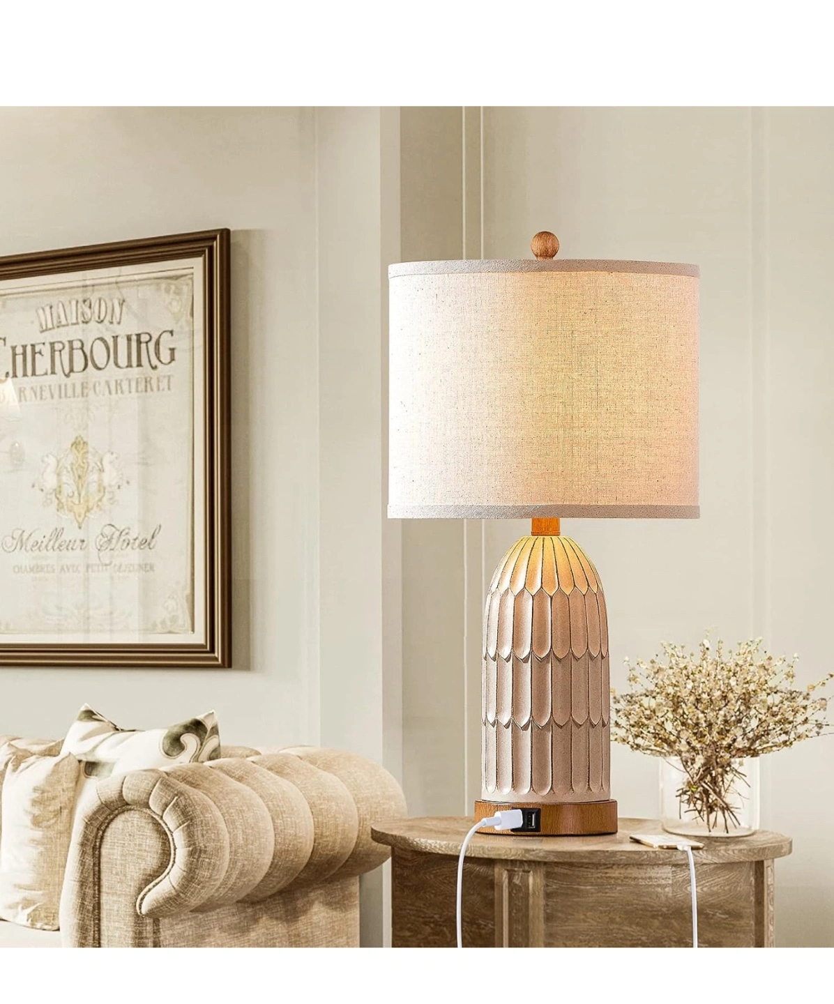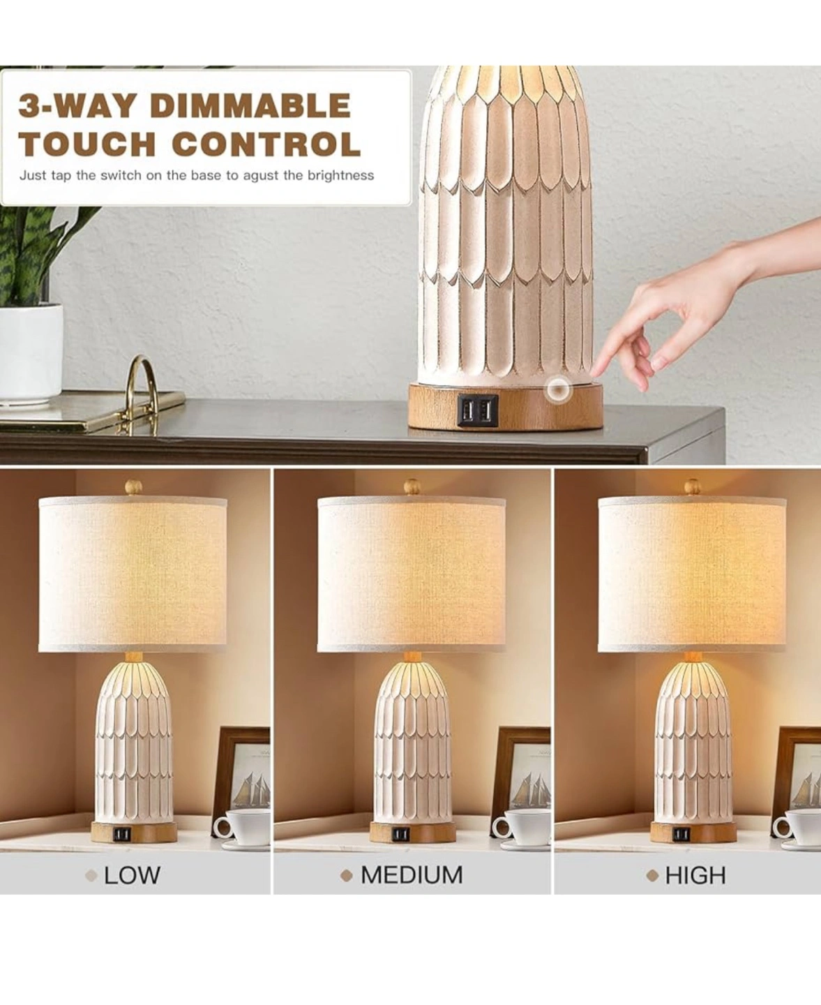 This table lamp is perfect for a bedroom or living room! It features: - Dual USB ports - 3-way dimmable touch control - Includes two free E26 base bulbs - Premium linen lampshade - Heavy resin lamp body It's 22 inches tall and 11 inches wide, perfect for a bedside table or end table