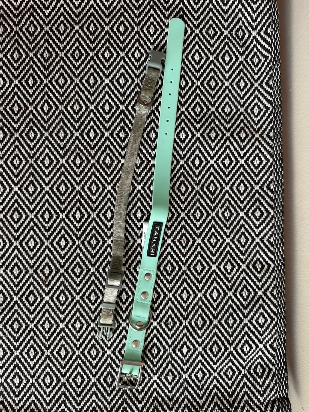 Two dog collars for sale! One is a mint green Tahari collar and the other is a XS grey collar. Both are in great condition and ready for a new furry friend! Pick up near Yonge and Bloor