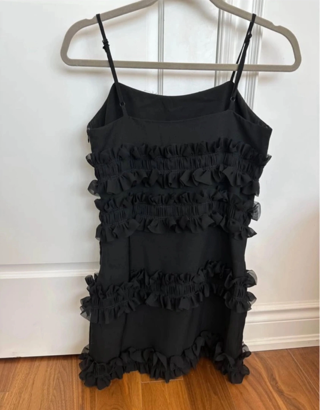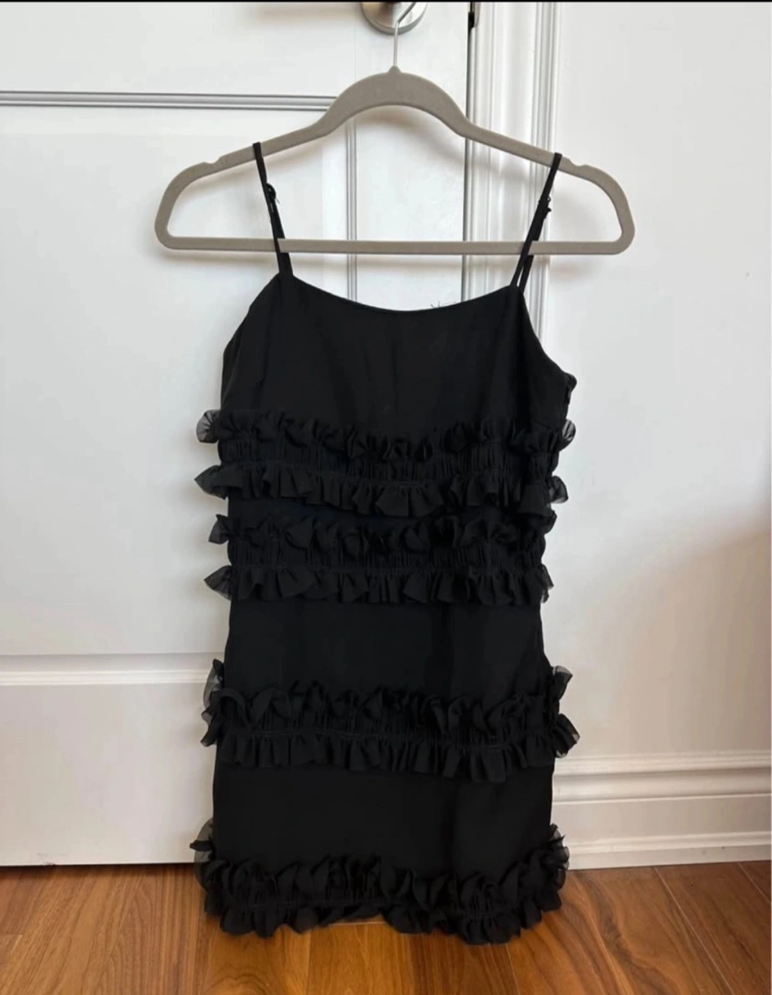 Here's a cute black mini dress with ruffle detailing! It's perfect for a night out or any special occasion. The dress is in great condition and ready for a new home