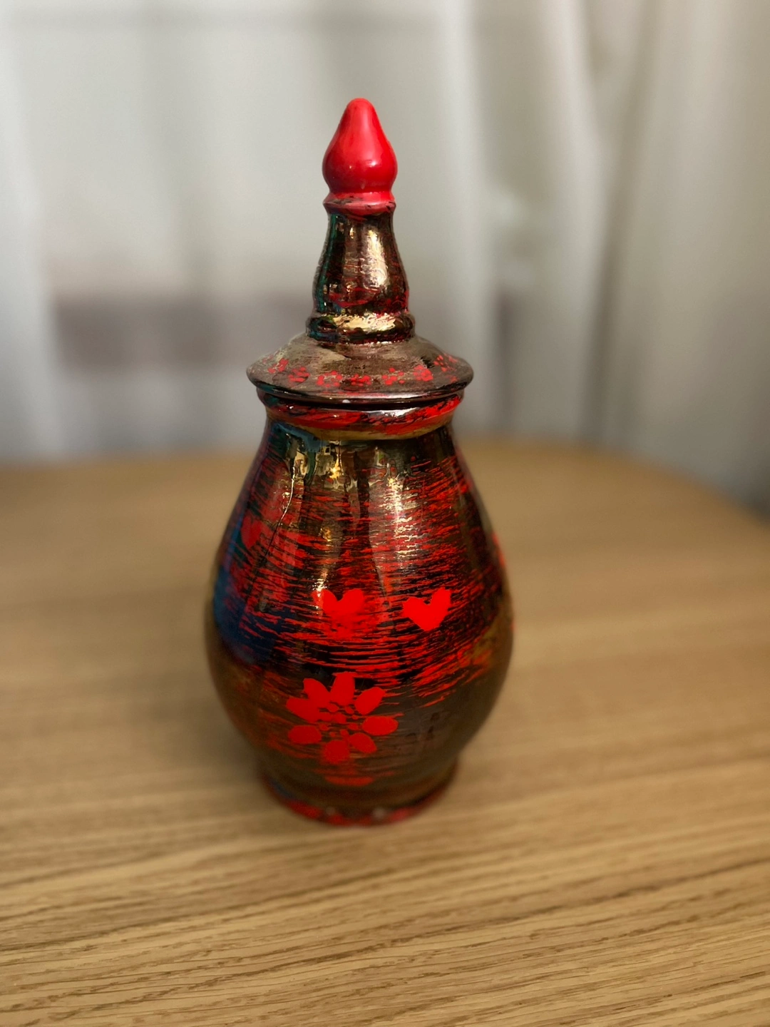 Selling a vintage Japanese jar with a lid. It features a beautiful red and gold design with floral accents. The bottom is covered in red felt. It would make a lovely addition to any home decor! ✨Moving Sale✨ ✨Need it Gone ASAP✨ ***Smoke Free, Pet Free Home*** *** Pick up Finch/McCowan *** *** Please check my other listings***