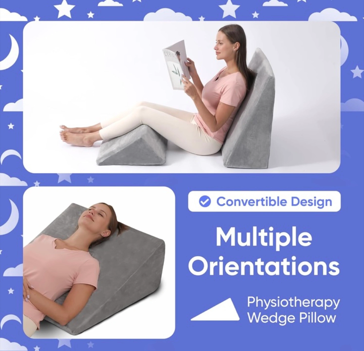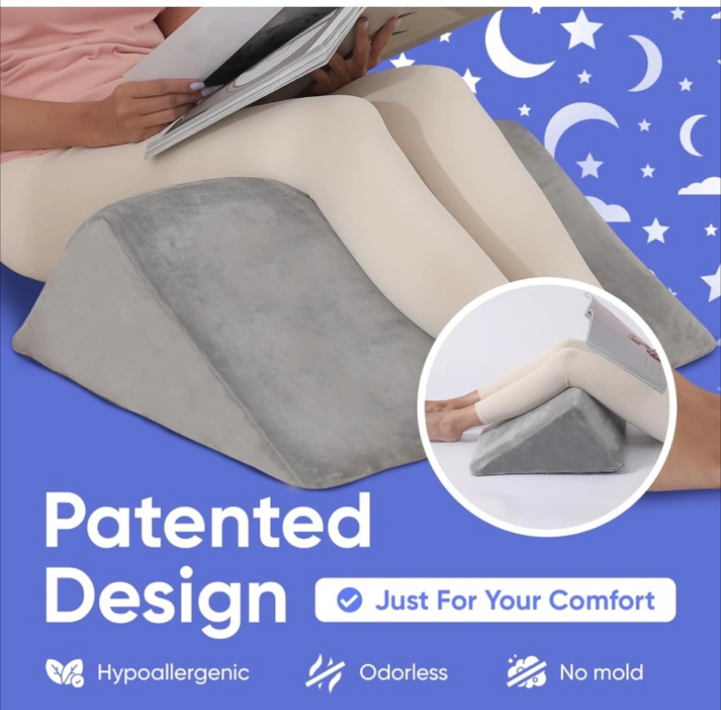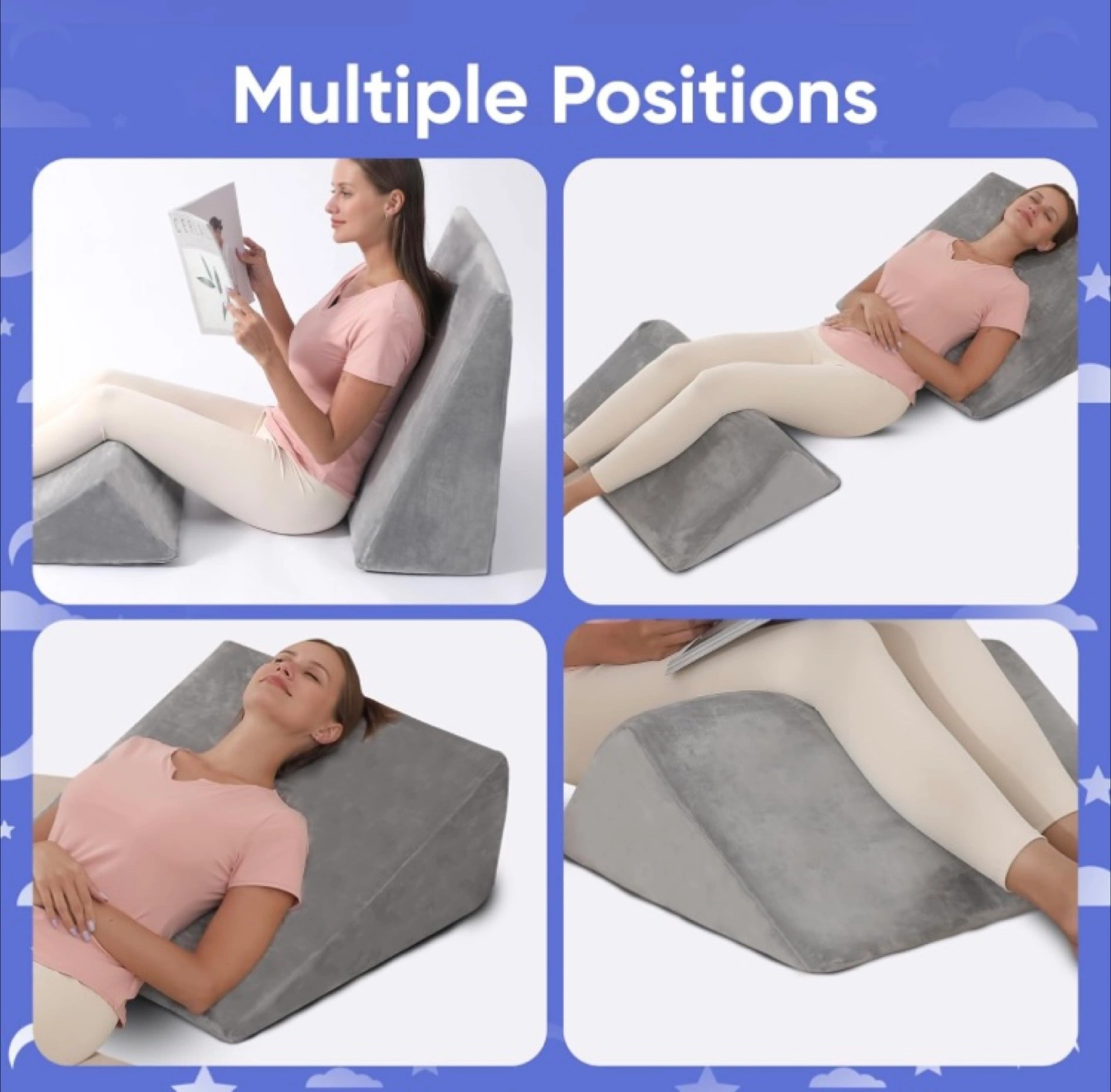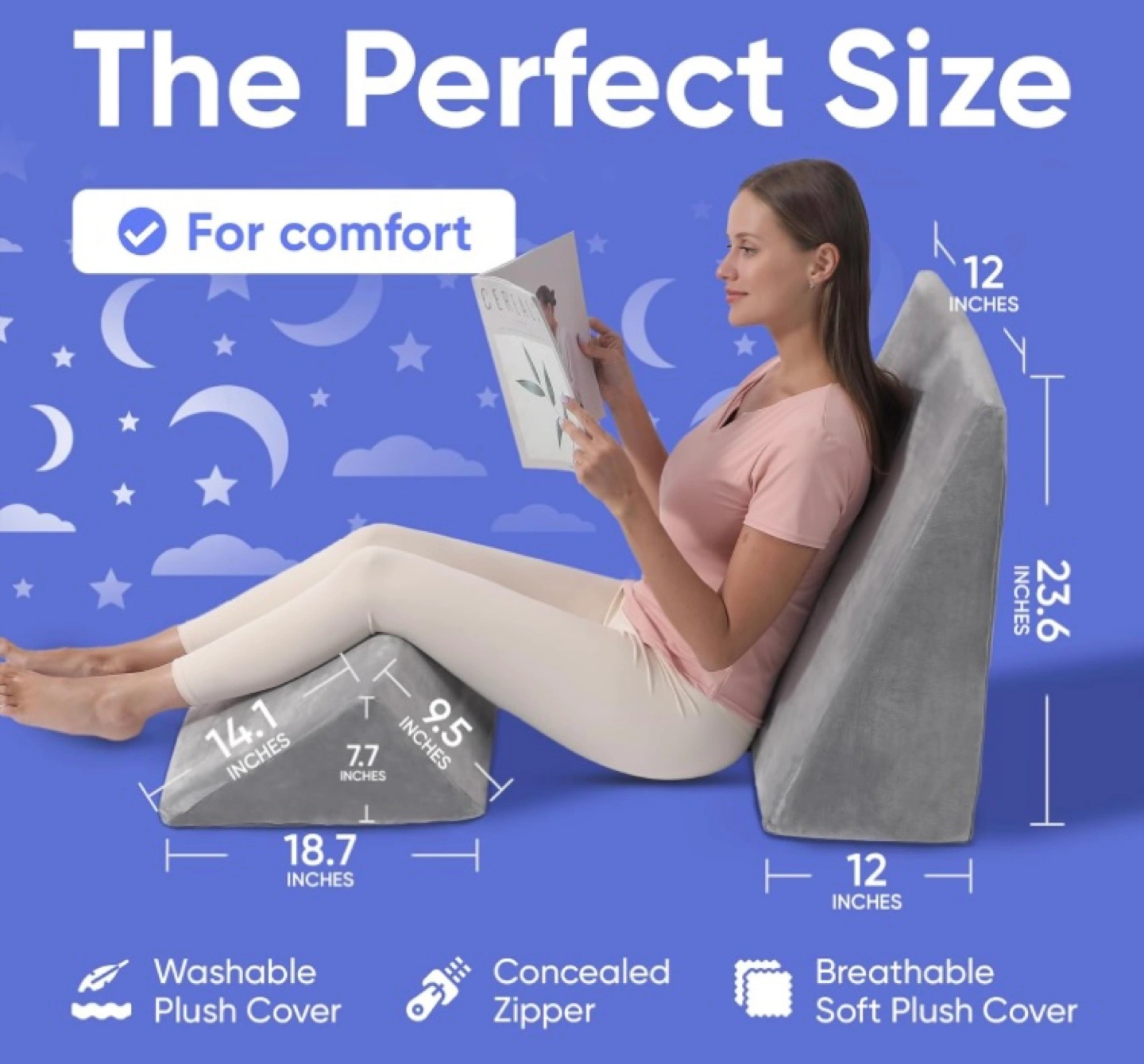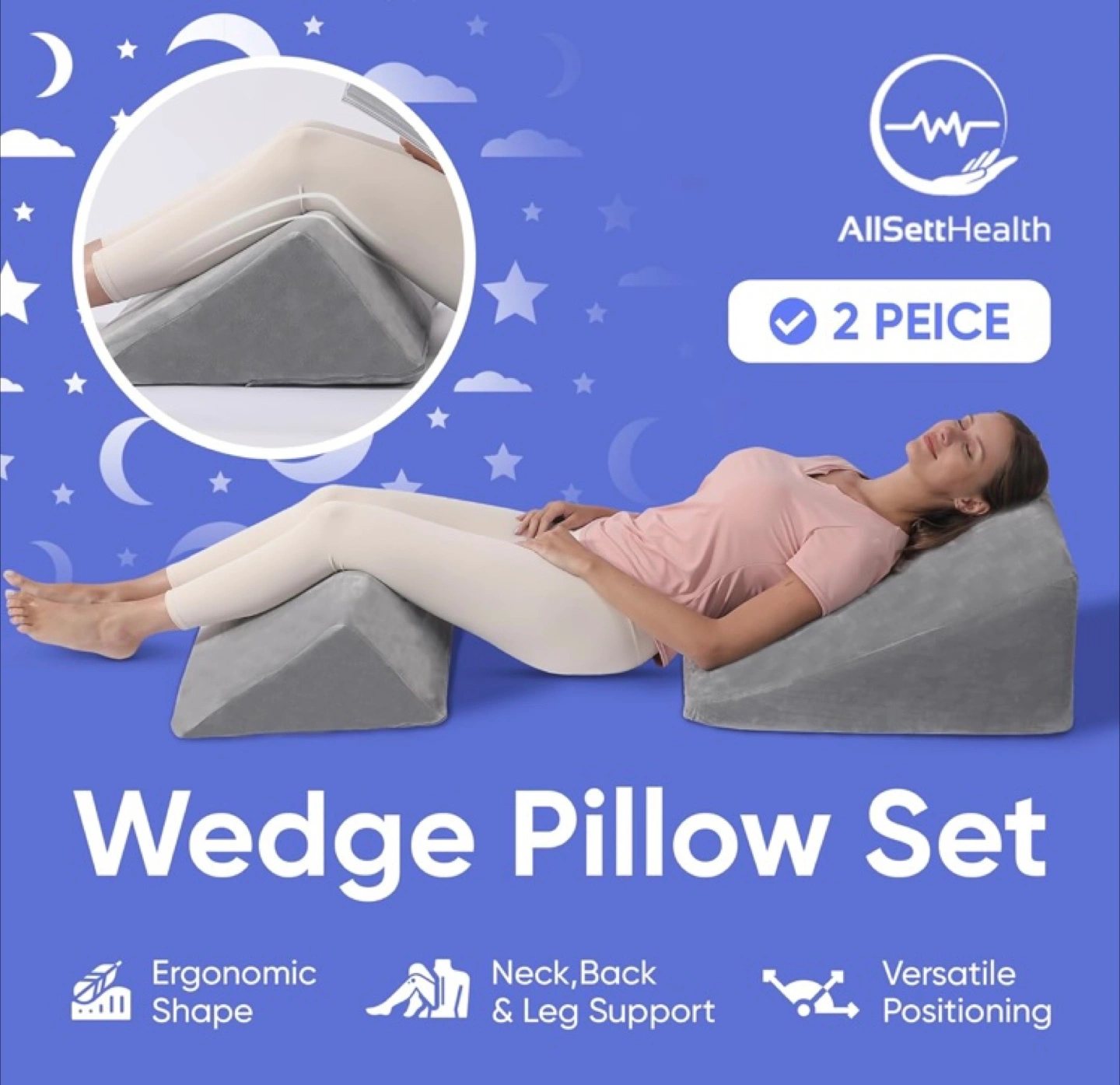 This AllSett Health wedge pillow set provides ergonomic support for your neck, back, and legs! It's designed for versatile positioning and ultimate comfort. The set includes a breathable inner cover and an ultra-soft, washable plush cover. It's hypoallergenic, odorless, and mold-resistant, ensuring a clean and comfortable experience