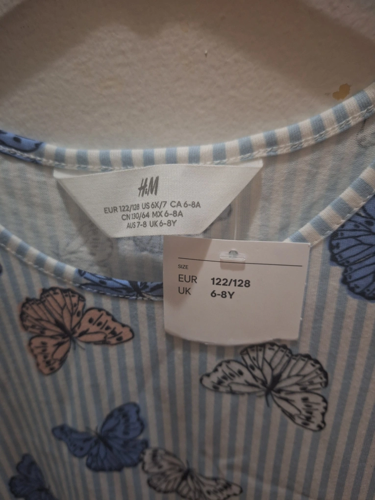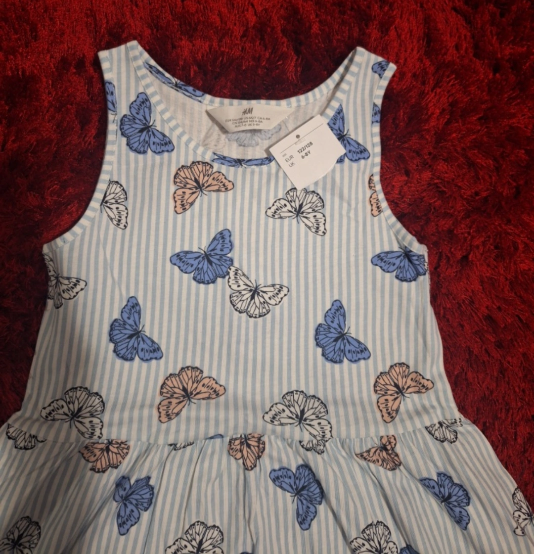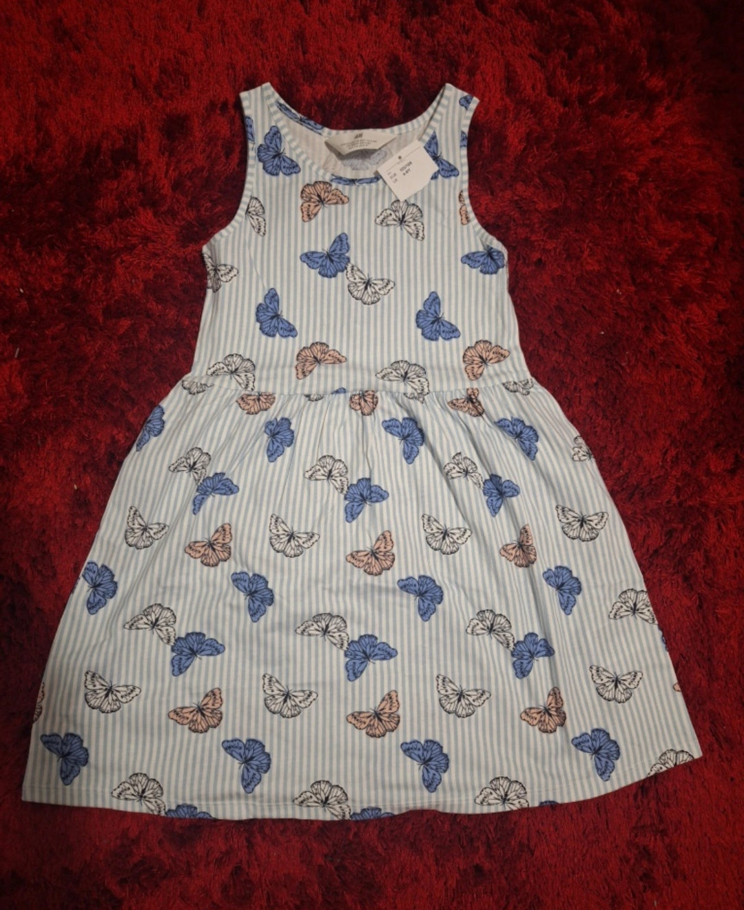 A cute H&M dress for girls, size 6-8 years. It features a lovely butterfly pattern on a striped background. Perfect for spring or summer!