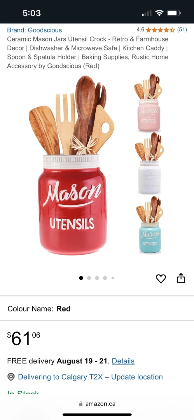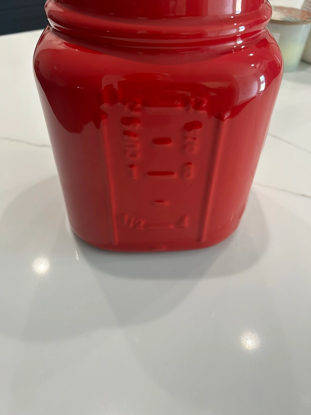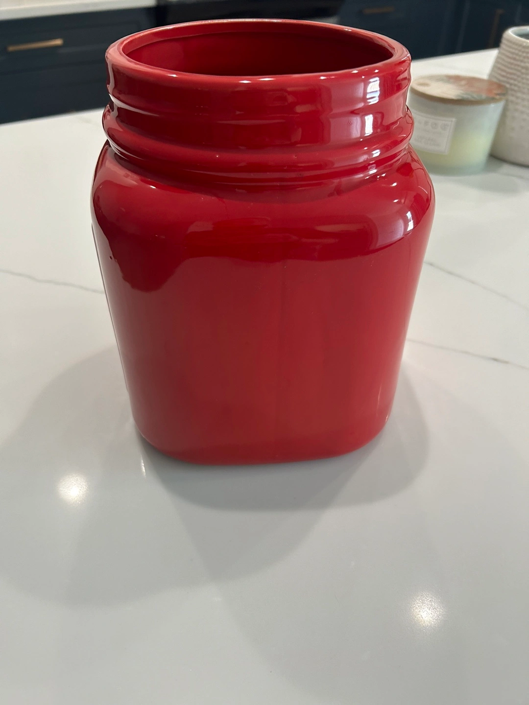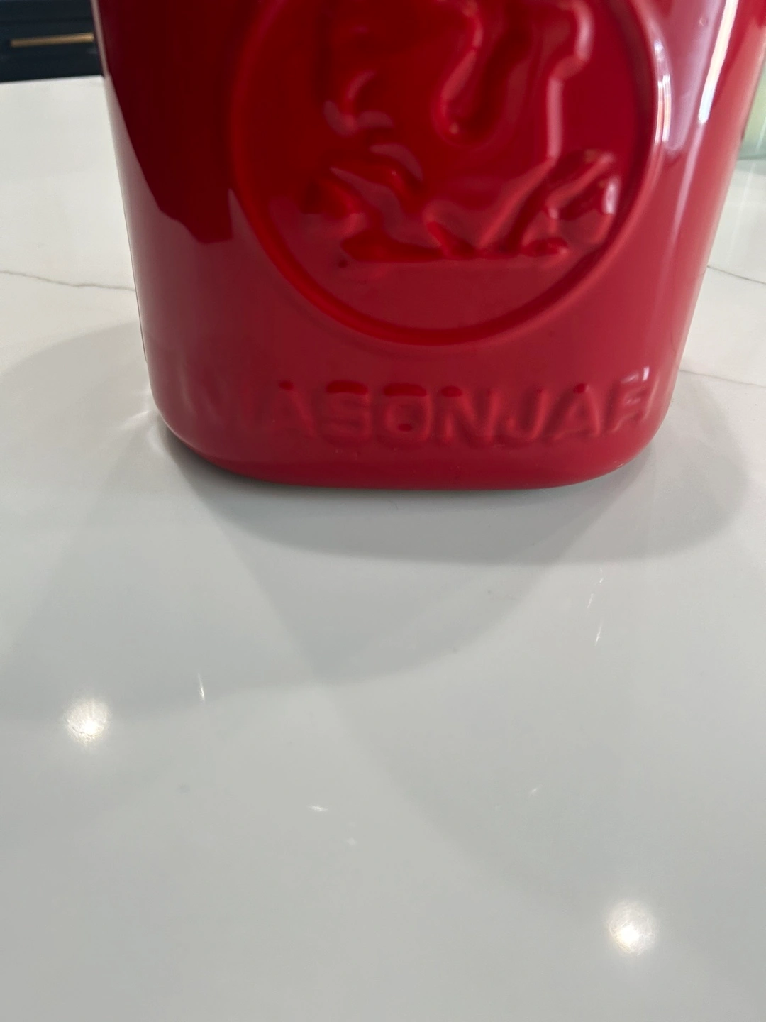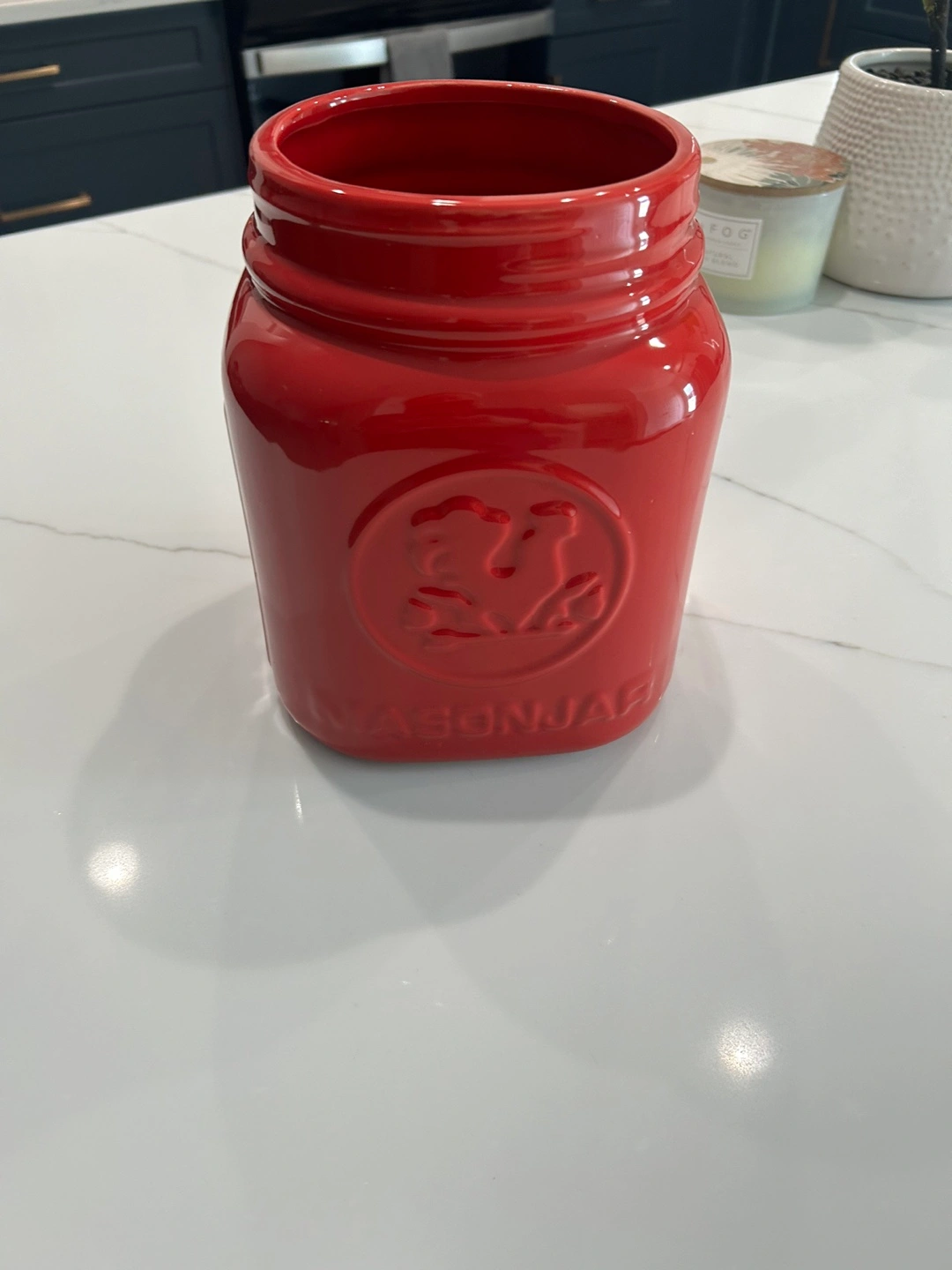 I'm selling a red large modern Mason jar container from Think Kitchen. It's perfect for storing various items like utensils or as a decorative piece in your kitchen.It's in perfect condition , was used in staging a kitchen photo shoot and ready for a new home! Stone wear stage for dishwasher