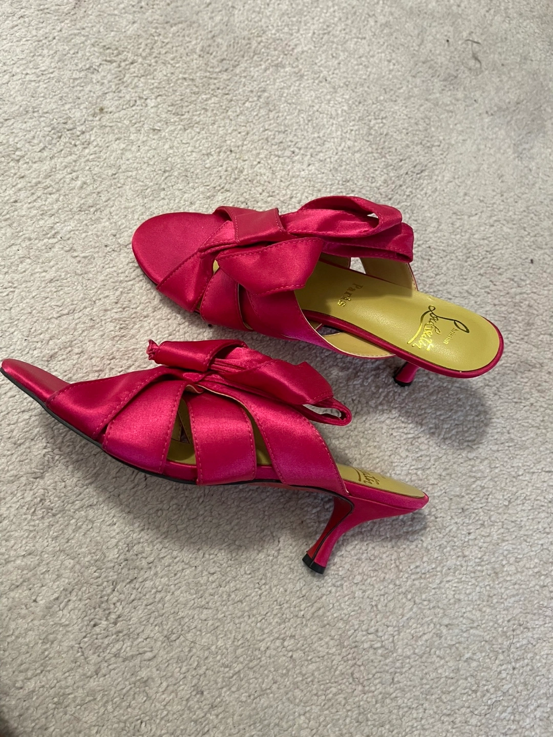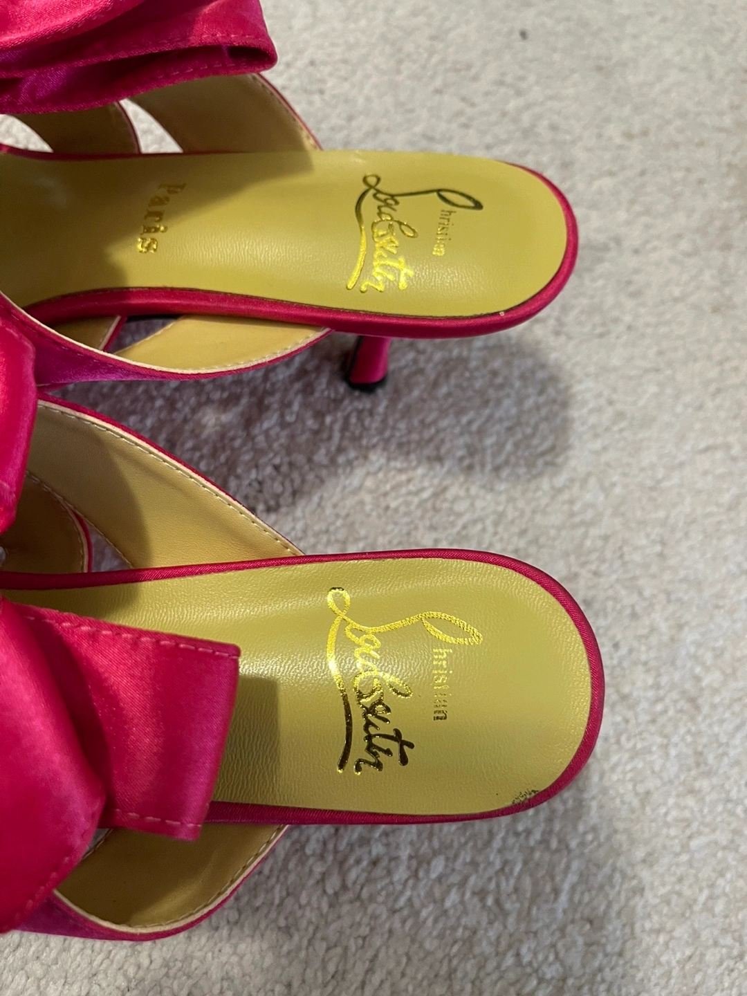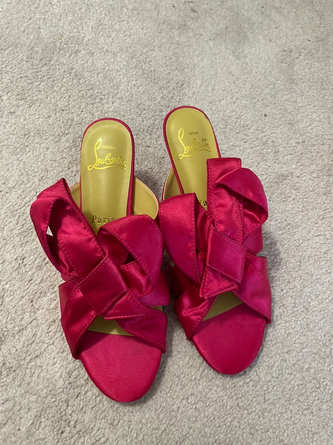 These Christian Louboutin mules are a vibrant pink satin and feature a stylish bow design. They're in great shape and ready for a new home! Perfect for adding a pop of colour to any outfit.