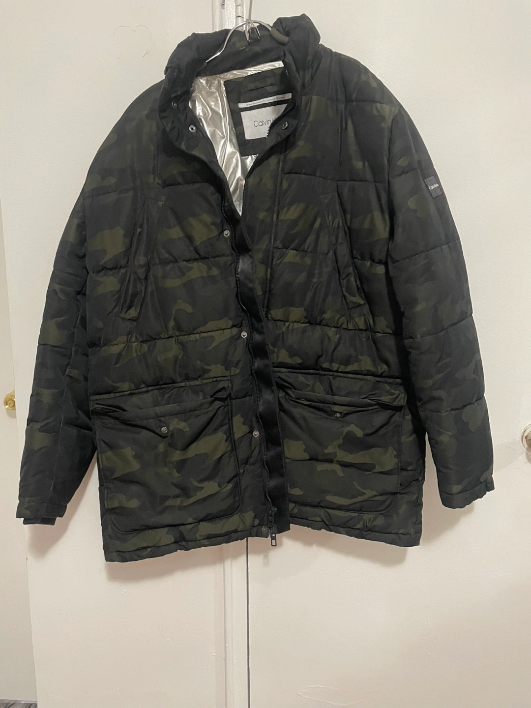 Here's a Calvin Klein puffer jacket! It features a stylish camo pattern on the outside and a silver lining on the inside. Perfect for staying warm and looking good!