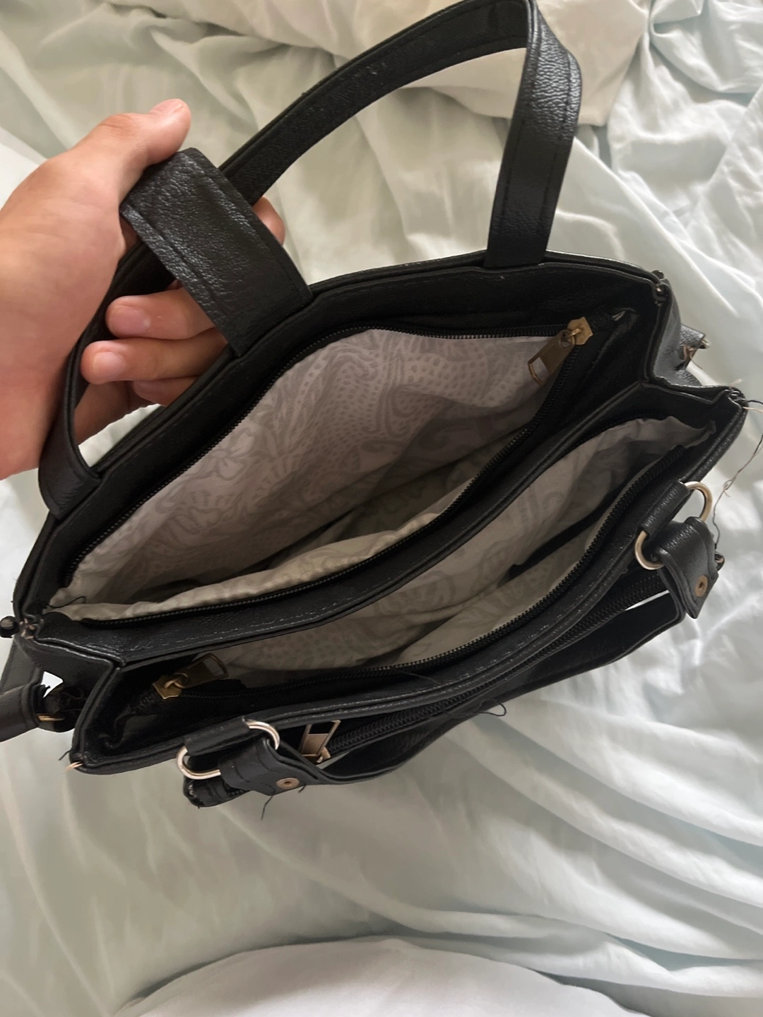 Here's a chic black handbag with an embossed pattern! It features a structured design with multiple compartments inside, perfect for keeping your essentials organized. It has a classic look and would be a great addition to your wardrobe!