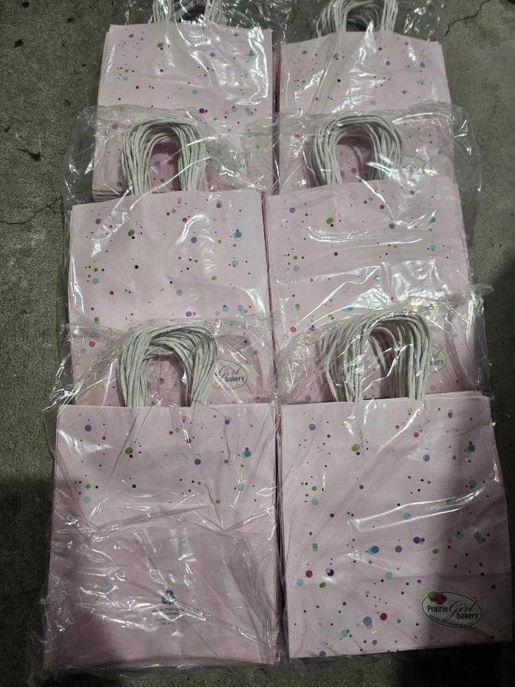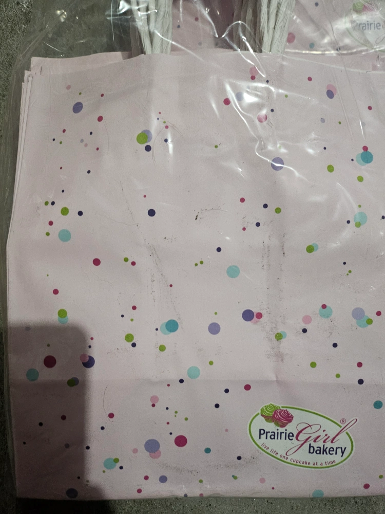 Selling a set of Prairie Girl Bakery paper bags! They're perfect for carrying your treats or using for small gifts. Each bag has a cute polka dot design and the Prairie Girl Bakery logo. They are in great condition and ready for a new home. $5 for 20 bags 9 x 10" dimensions