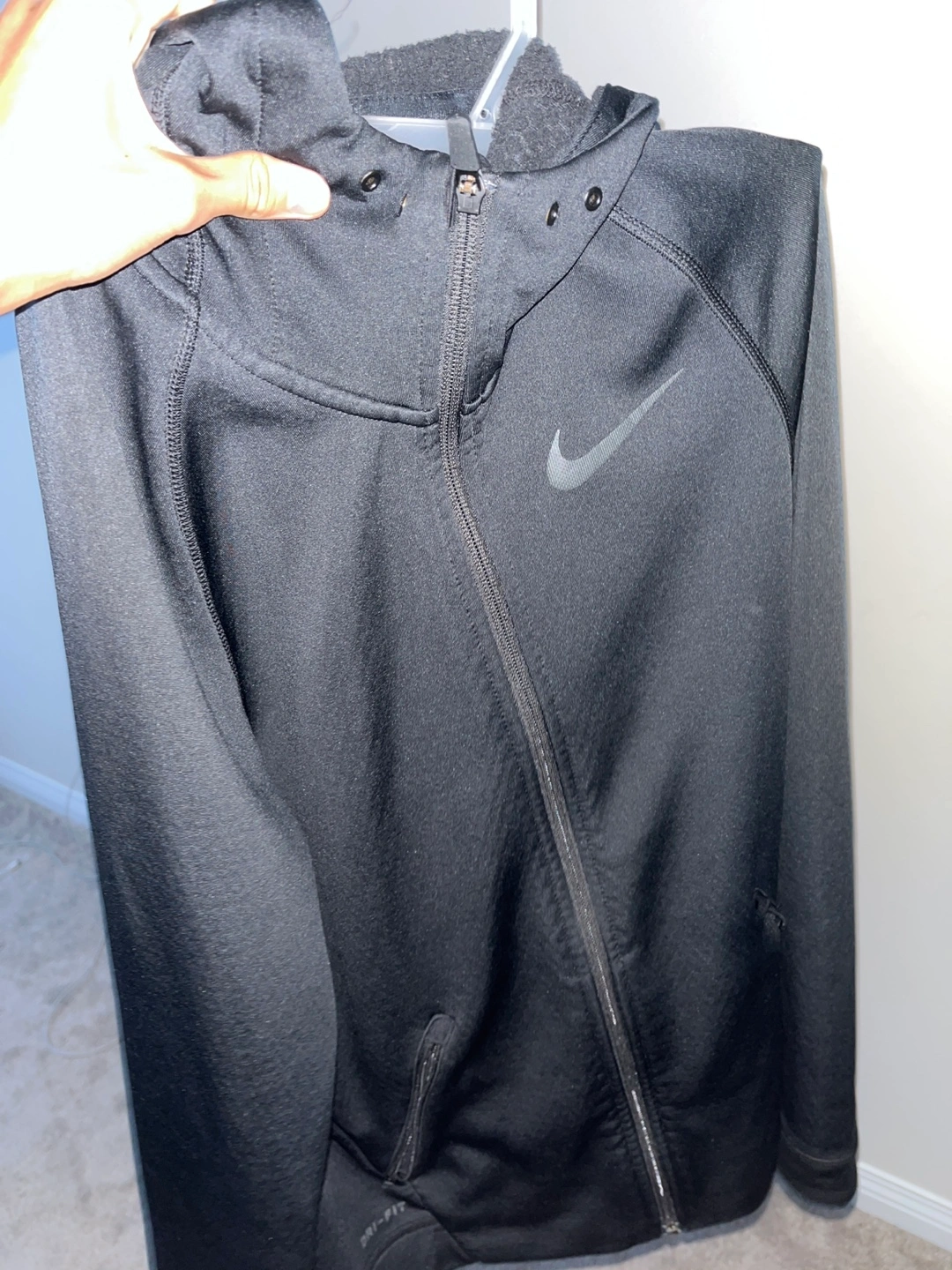 Selling a black Nike Dri-FIT hoodie. It's in great condition and perfect for workouts or everyday wear. The Dri-FIT material helps keep you dry and comfortable