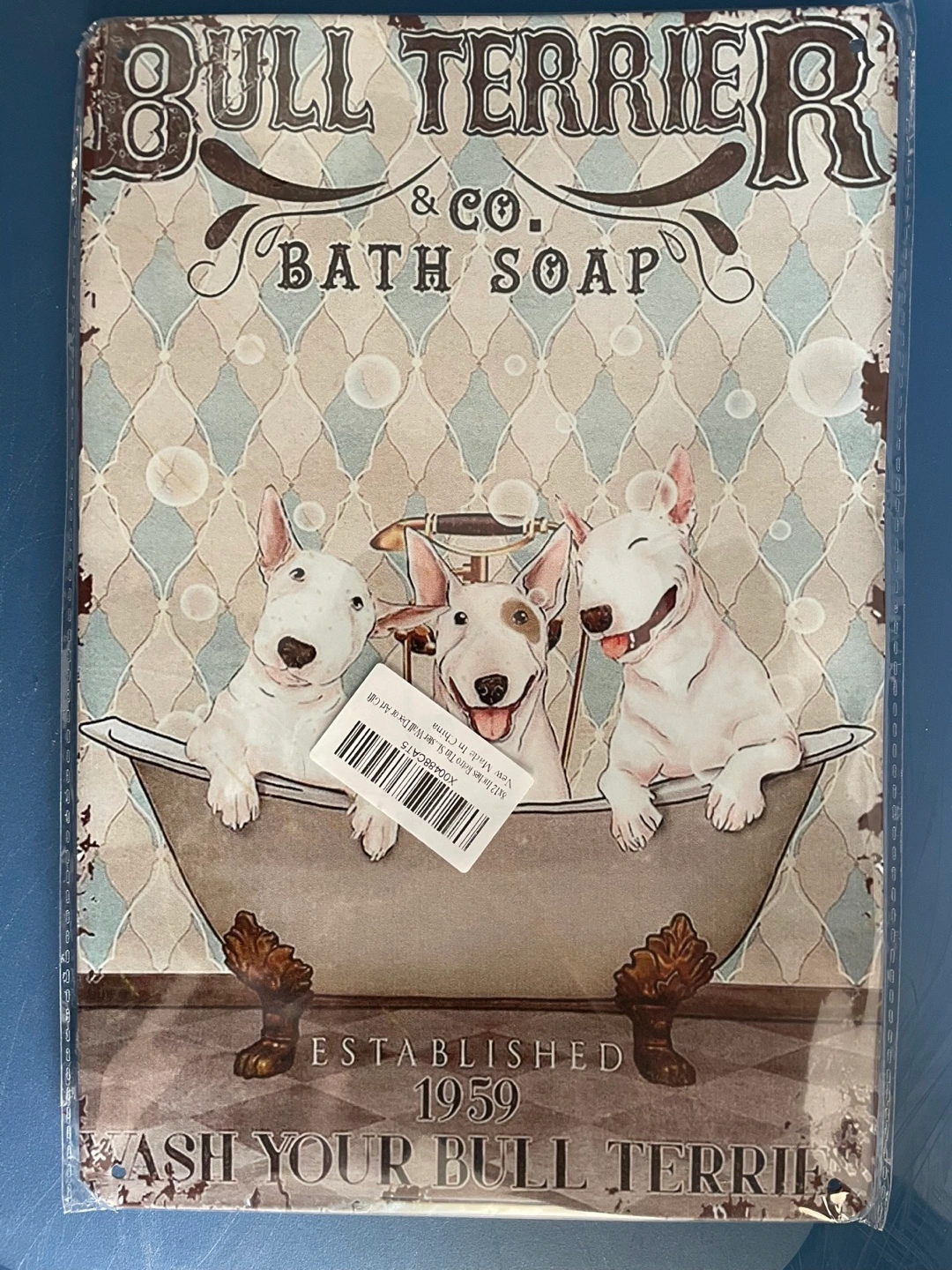 This is a new retro tin sign featuring Bull Terriers & Co. Bath Soap. It's a cute wall decor item with an old-fashioned look. The sign reads "Established 1959" and "Wash Your Bull Terrier". It measures 8x12 inches and is still in its original packaging