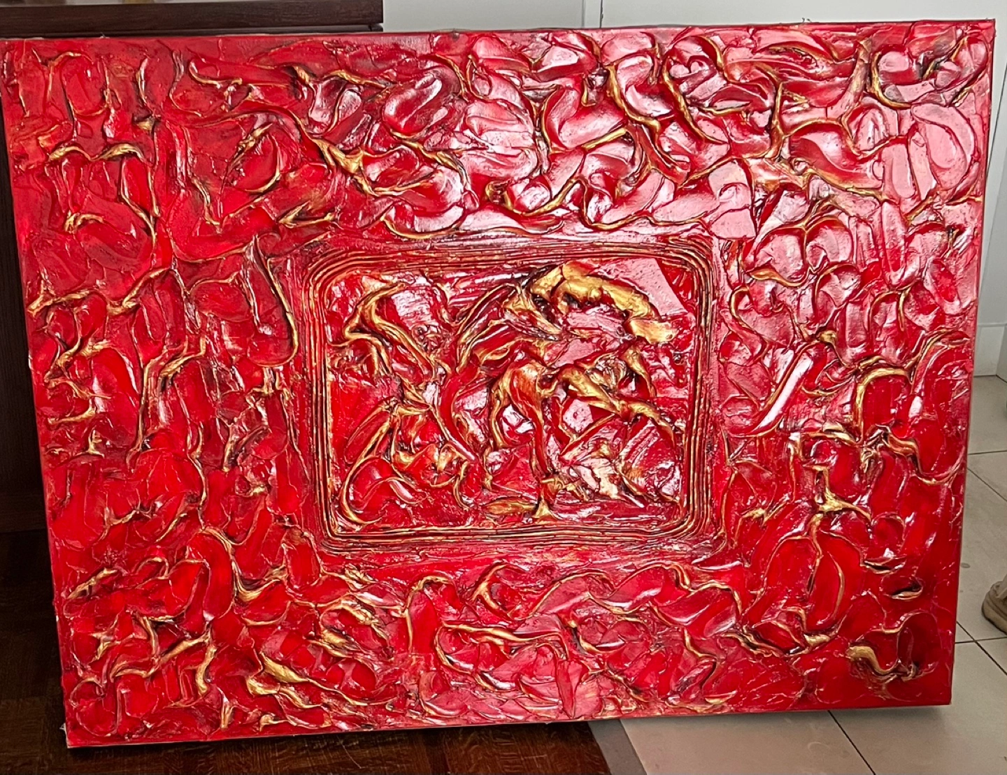 This is a vibrant abstract painting featuring a raised, textured surface in shades of red and gold. It would make a great statement piece for any room!