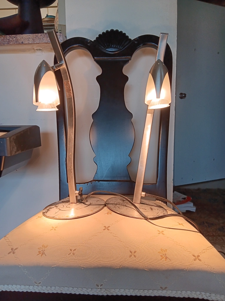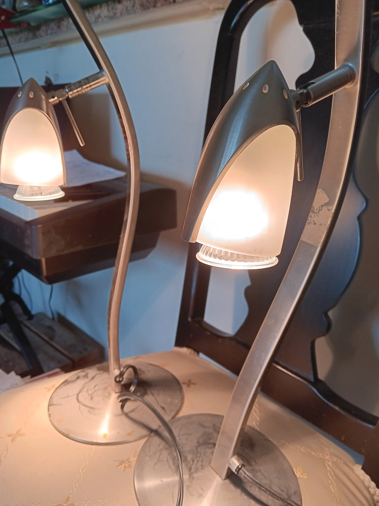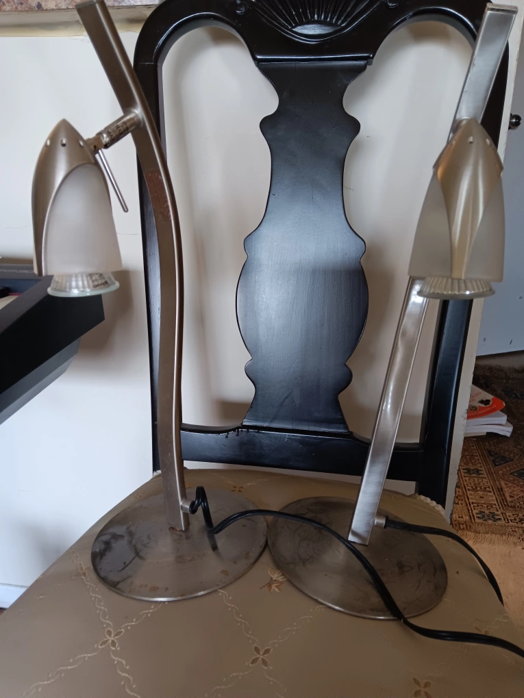 Selling a pair of modern-style desk lamps with a sleek silver finish. These lamps would add a touch of contemporary style to any desk or workspace. They're in great shape and ready to light up your home!