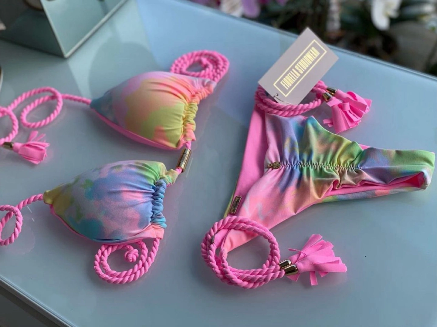 This is a cute bikini set from Fiorella Swimwear. It features a unique tie-dye pattern with pink rope detailing. Perfect for the summer!