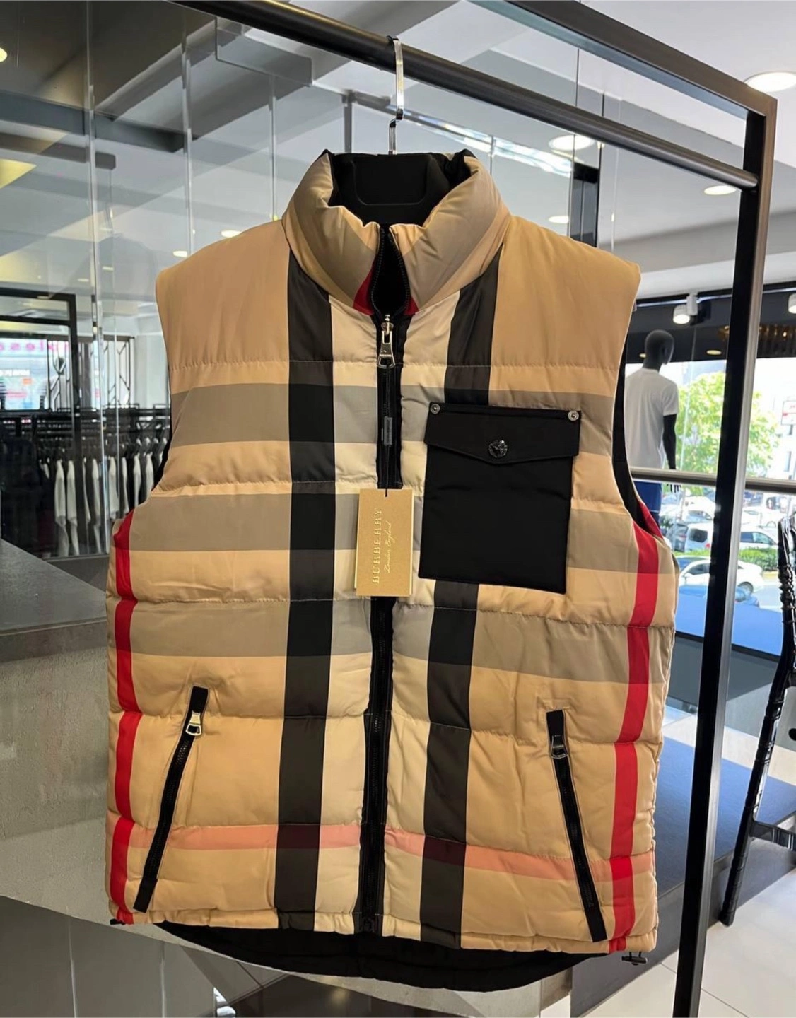 Selling a Burberry reversible vest. It has a beige and black check pattern with a black pocket detail. Perfect for layering!