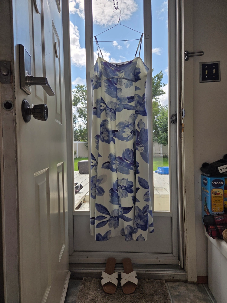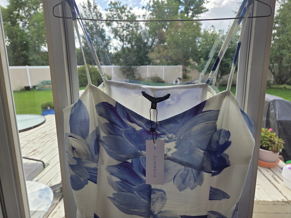 Blue flower white dress bought from dynamite in june. This beautiful dress has adjustable straps and is long dress. Perfect for graduation, wedding, or showers. White sandles to match. non-negotiable $, recently bought has no stains or rips. I am open to trading for a similar priced short dress or womens clothing!
