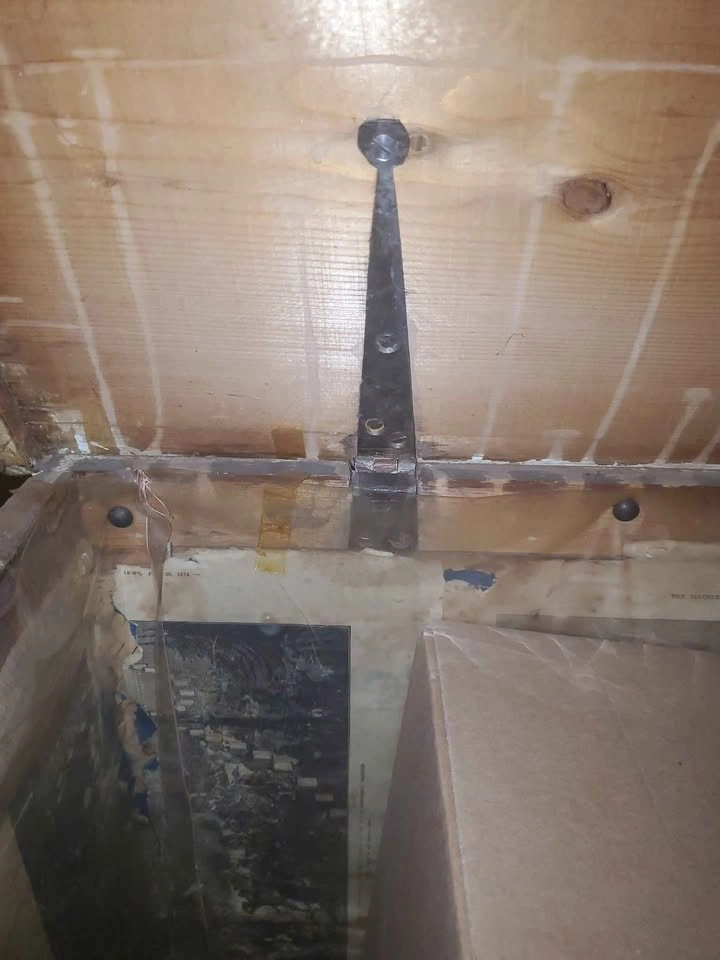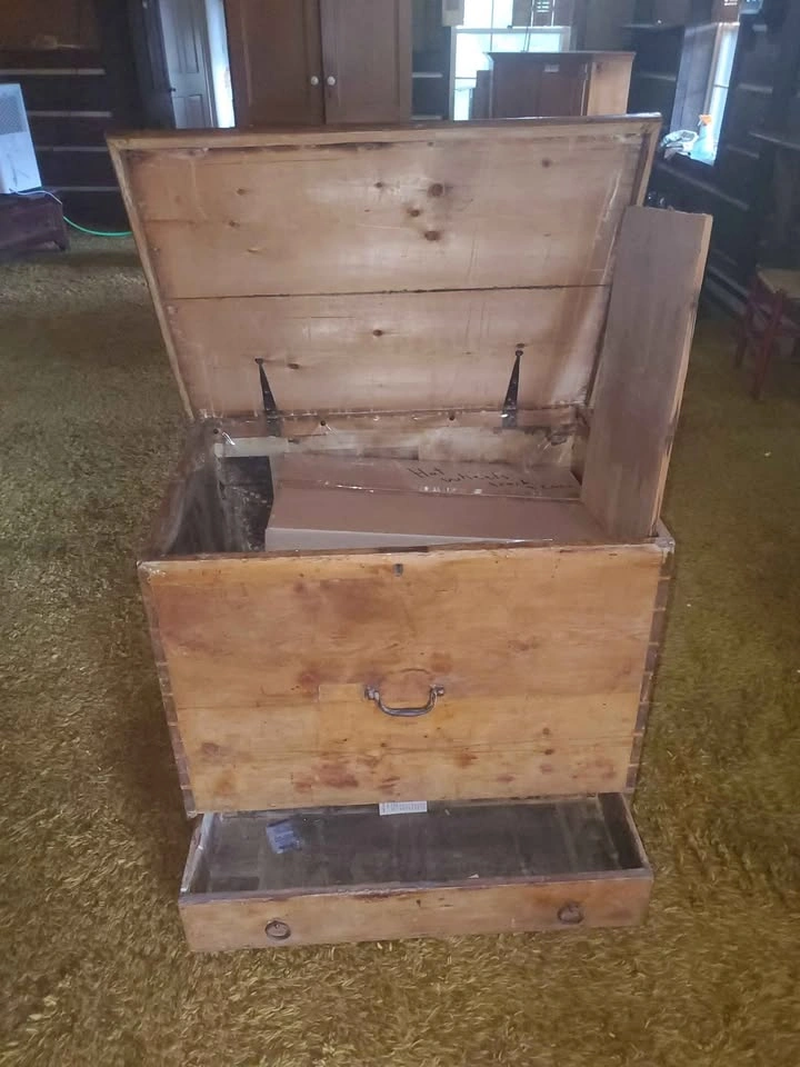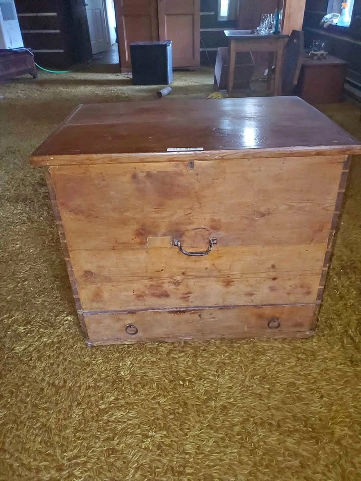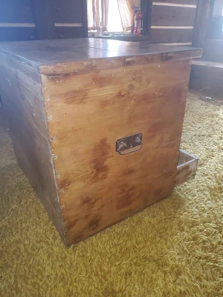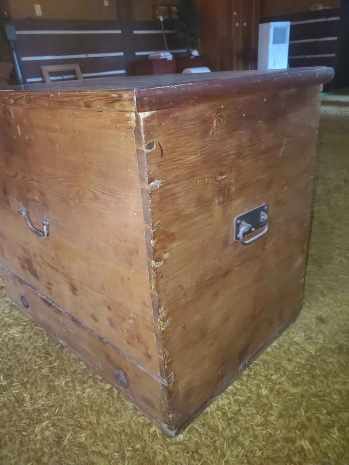 Pine chest 32inchesx 23x 26 lined with old newpapers