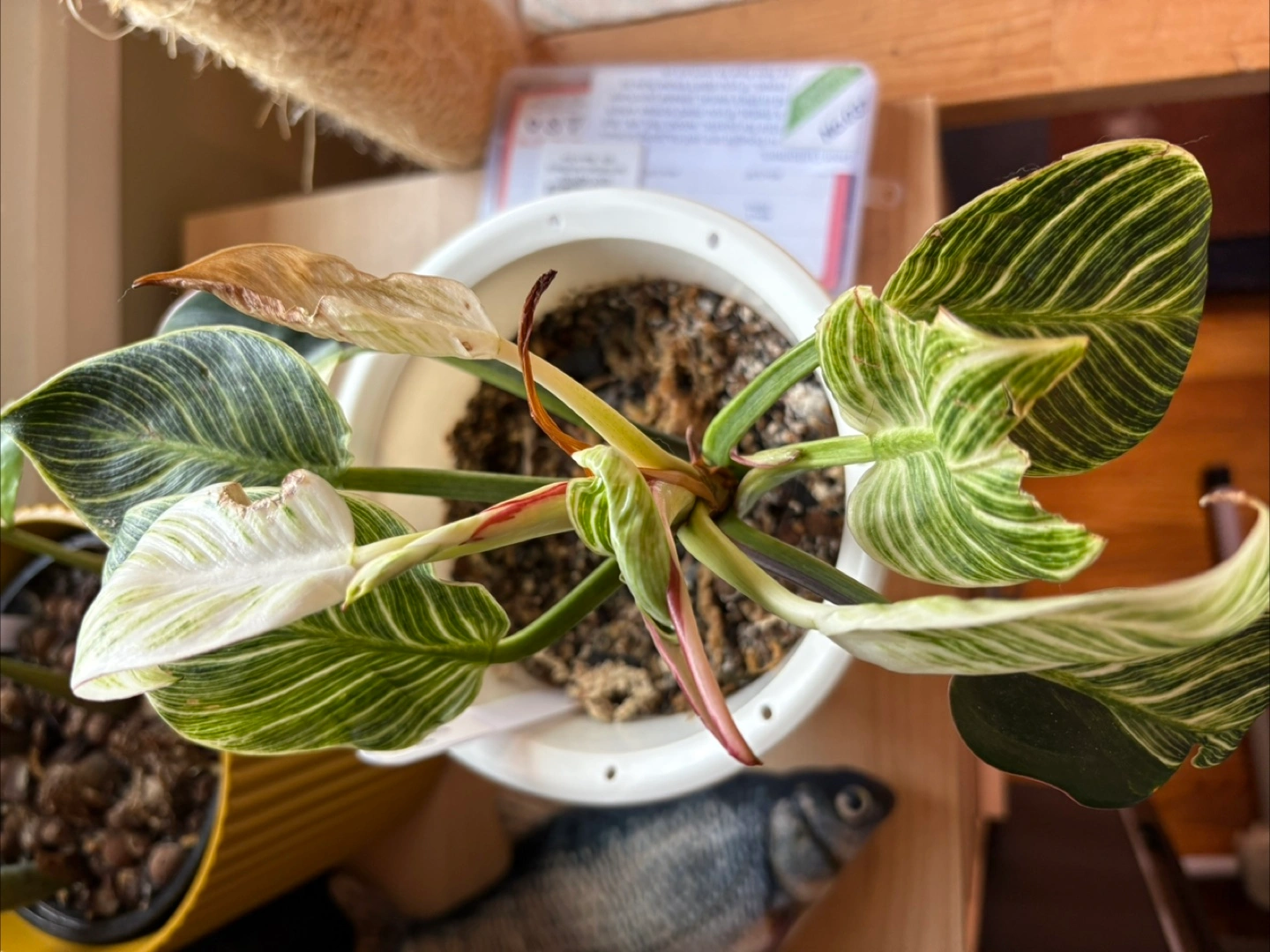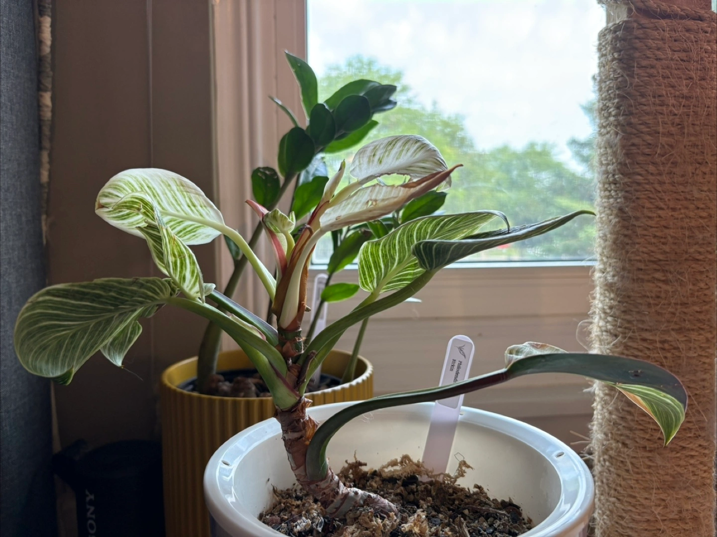 Selling a rather worn down Birkin Philodendron plant! It has beautiful striped leaves and is in a white pot. It's a great addition to any indoor space and easy to care for She survived with me throughout my most depressed period so it’ll take a lot for it to perish. I’ve repotted her in a self watering pot and she’s doing very well. The more light she gets, the more variegation you will see in her leaves.