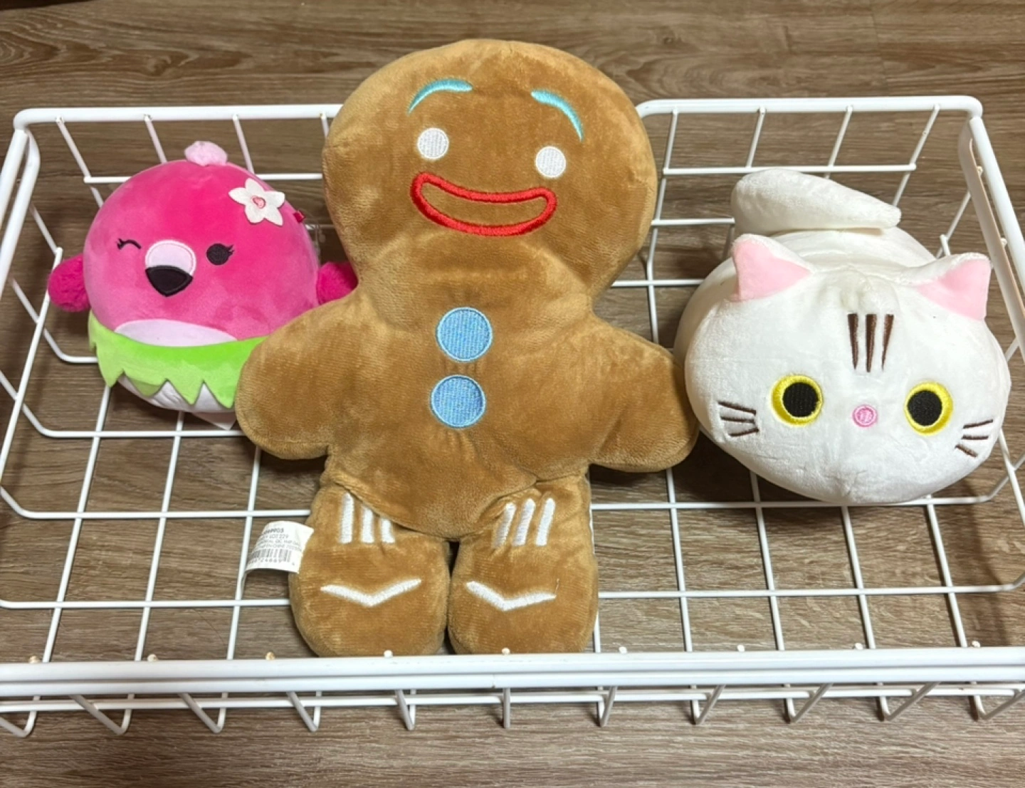 A cute collection of plush toys for sale! Includes a scented squish mellow, a gingerbread man, and a white cat plushie. Perfect for kids or collectors