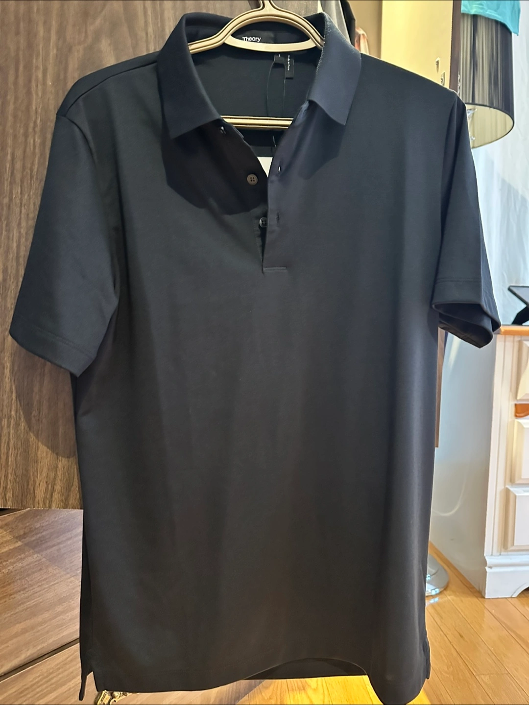 Selling a Theory black polo shirt. It's in great condition and would be a great addition to your wardrobe! It's a classic and versatile piece that can be dressed up or down