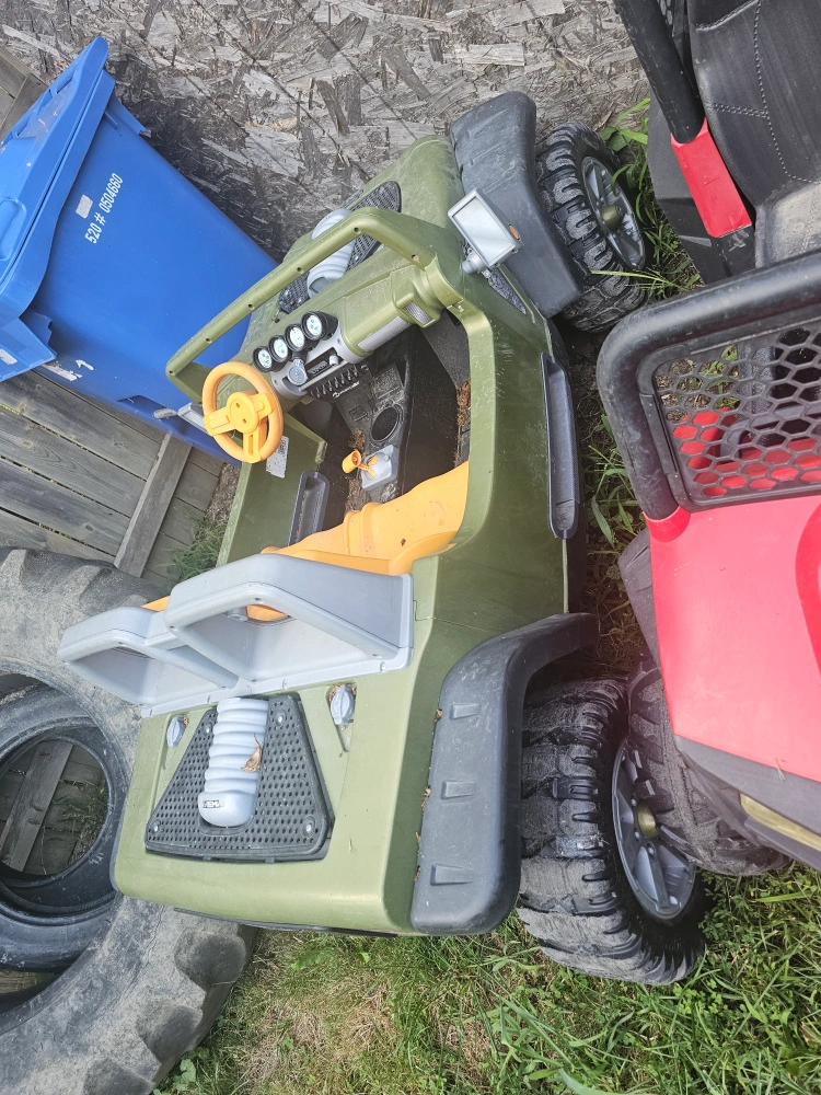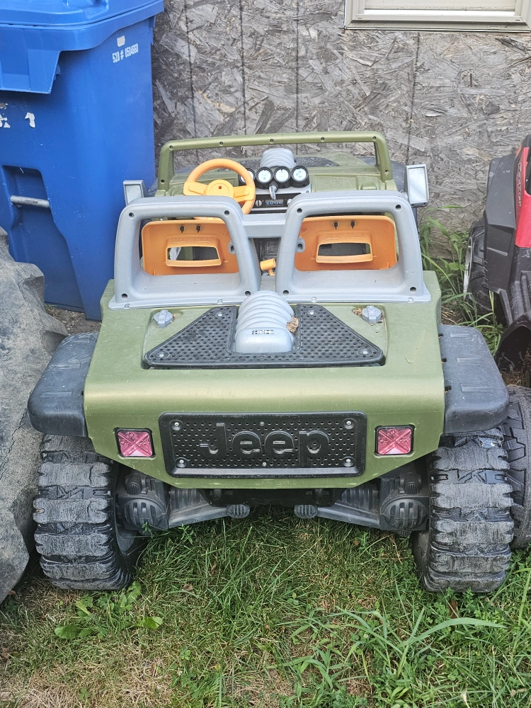 Selling a used Jeep ride-on toy car. It's green and perfect for kids who love adventure! Great for outdoor fun! does have battery but not other end to charge