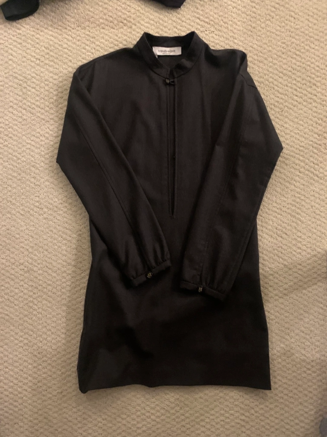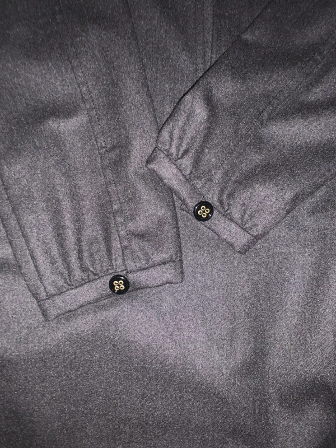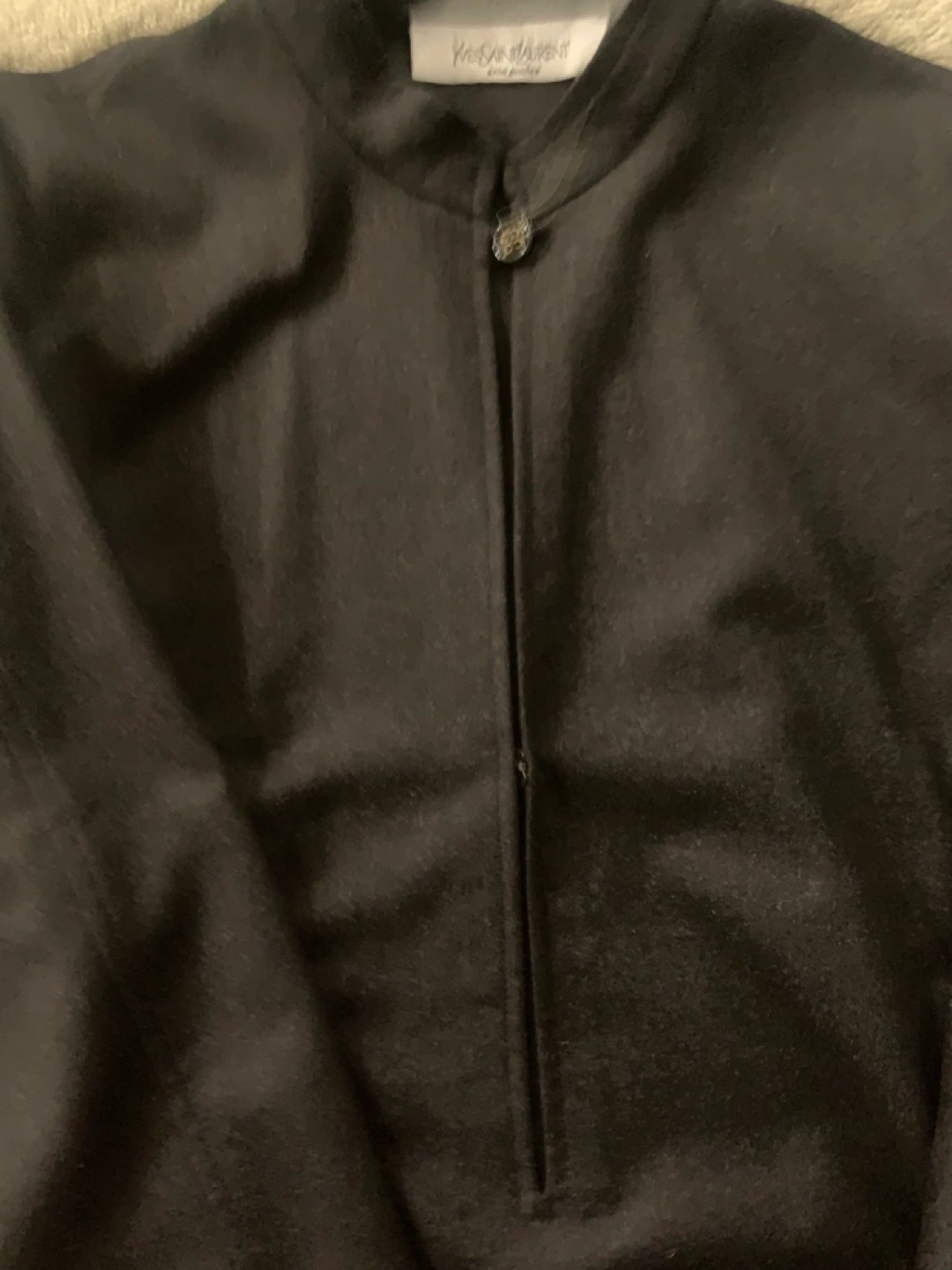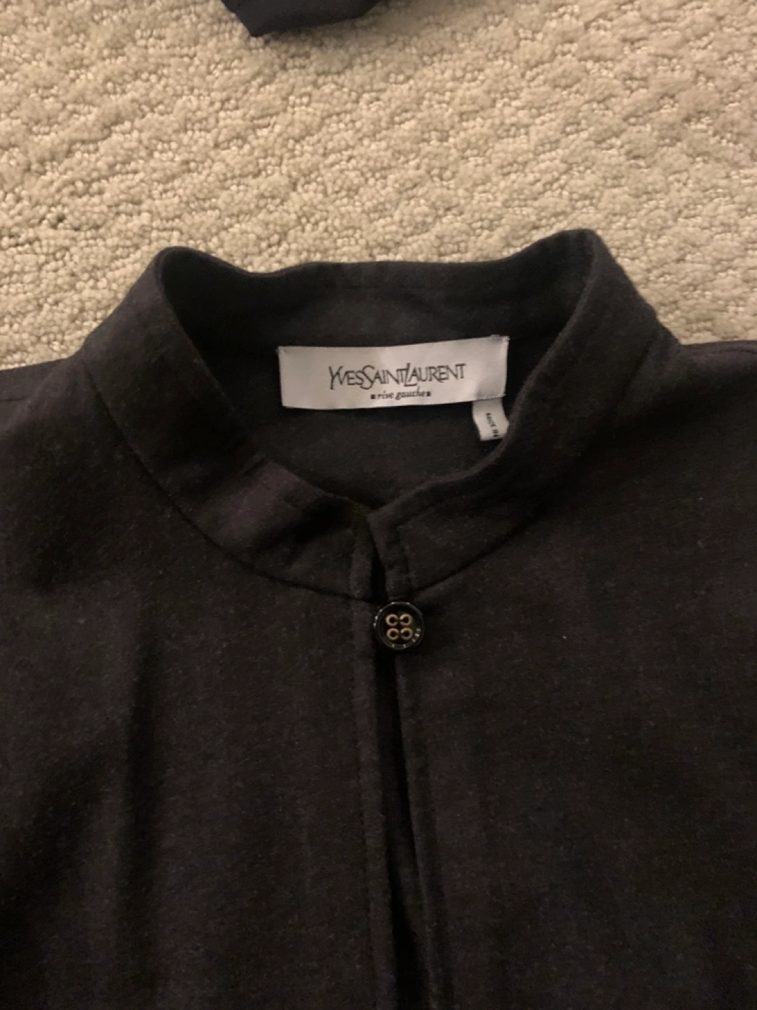 A stylish dark grey dress from Yves Saint Laurent. It features a unique collar and button details on the sleeves. This dress is perfect for any occasion!