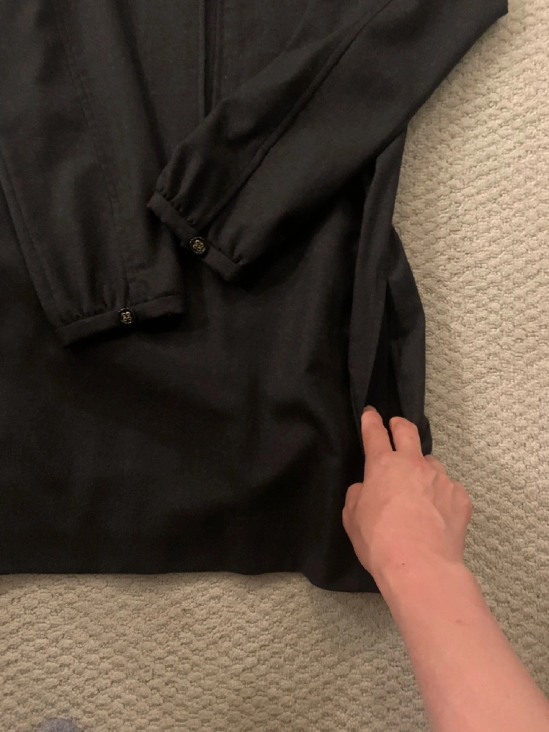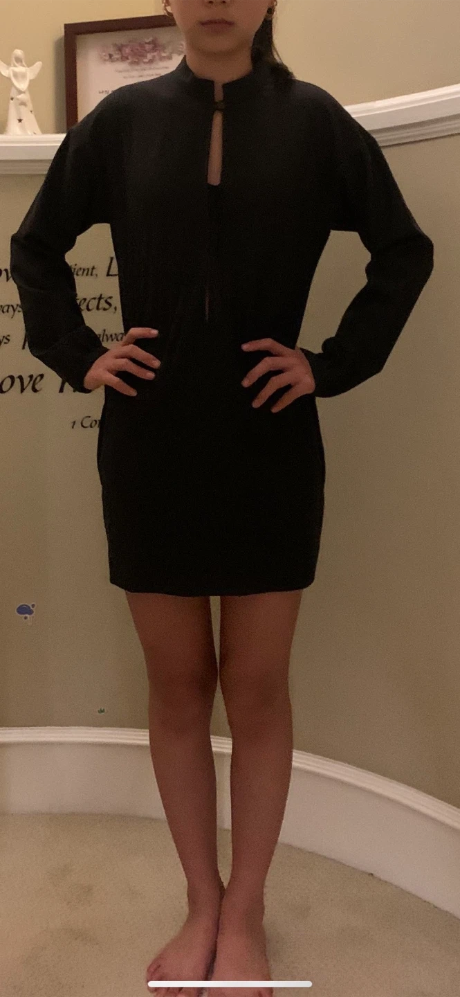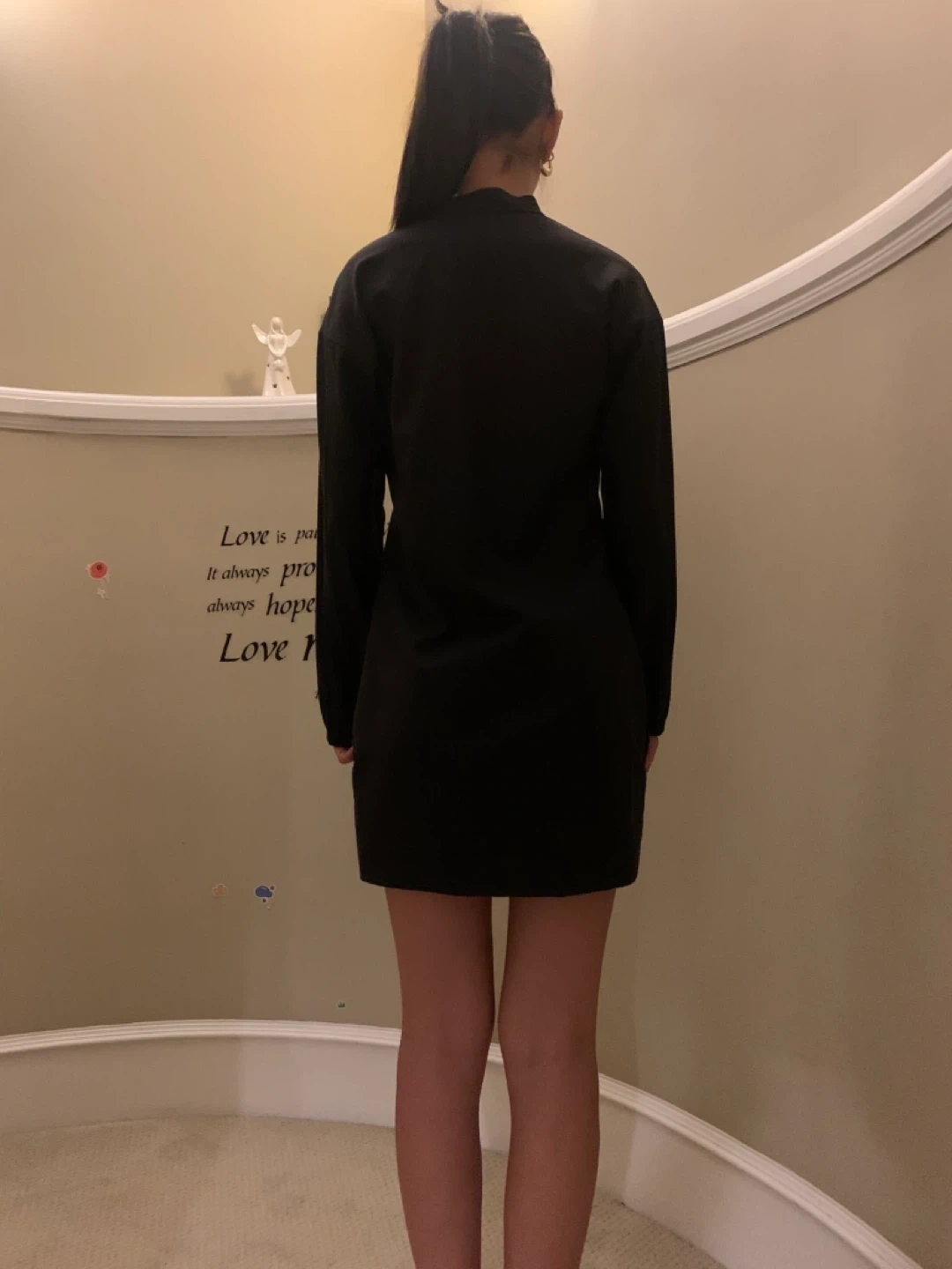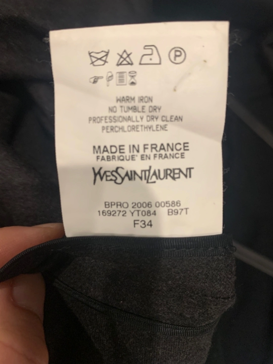 A stylish dark grey dress from Yves Saint Laurent. It features a unique collar and button details on the sleeves. This dress is perfect for any occasion!