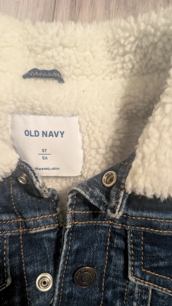 Cozy Old Navy denim jacket for kids! This jacket is a size 5T and features a sherpa lining for extra warmth. Perfect for keeping your little one snug during cooler fall weather.
