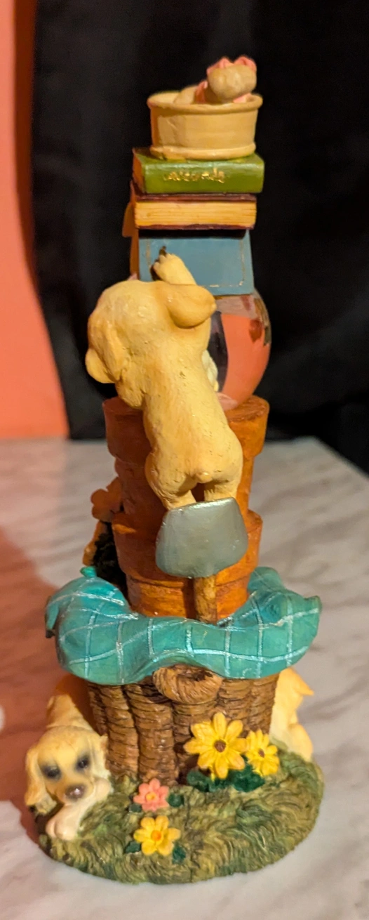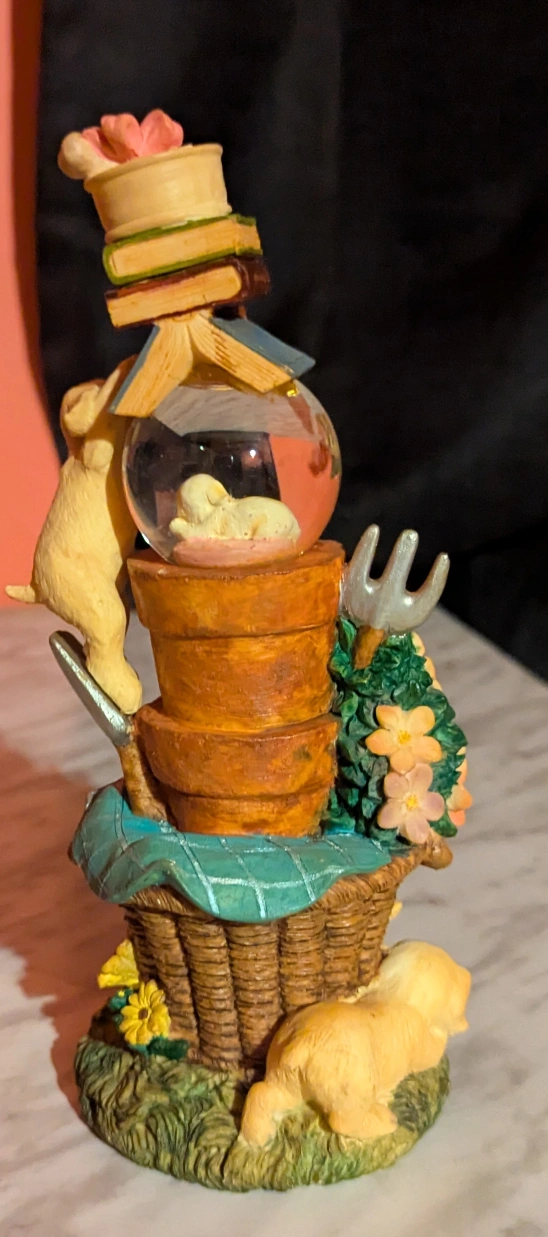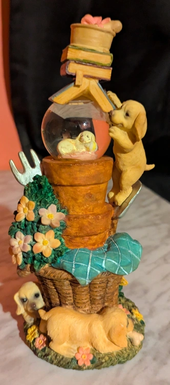 This cute figurine features golden retriever puppies in a garden-themed display. It includes details like flower pots, a basket, gardening tools, and even a snow globe with a sleeping puppy inside. It would make a lovely addition to any home!