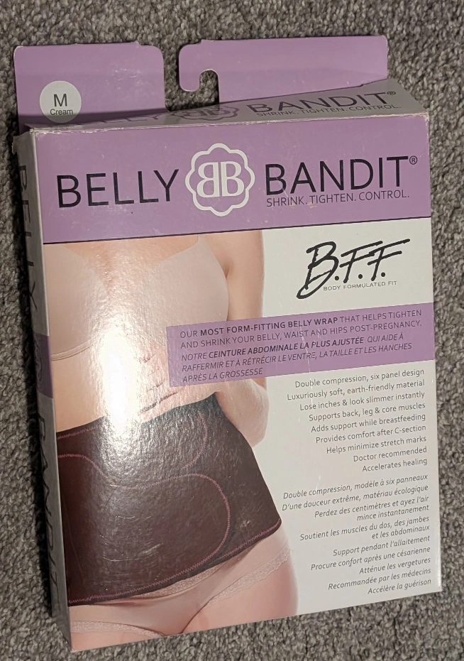Selling a Belly Bandit B.F.F. belly wrap in size medium and the colour cream. This is designed to help tighten and shrink your belly, waist, and hips post-pregnancy. It features: - Double compression, six panel design - Earth-friendly material - Supports back, leg, and core muscles - Helps minimize stretch marks - Doctor recommended and accelerates healing