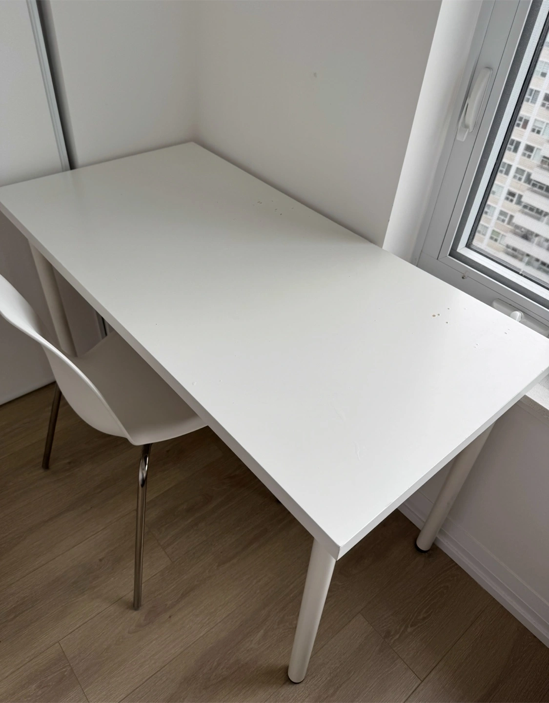 August28-31 Available Selling a simple white desk, perfect for a home office or study space. It's in good condition and ready for a new home. It's a great size for a student or anyone needing a compact workspace