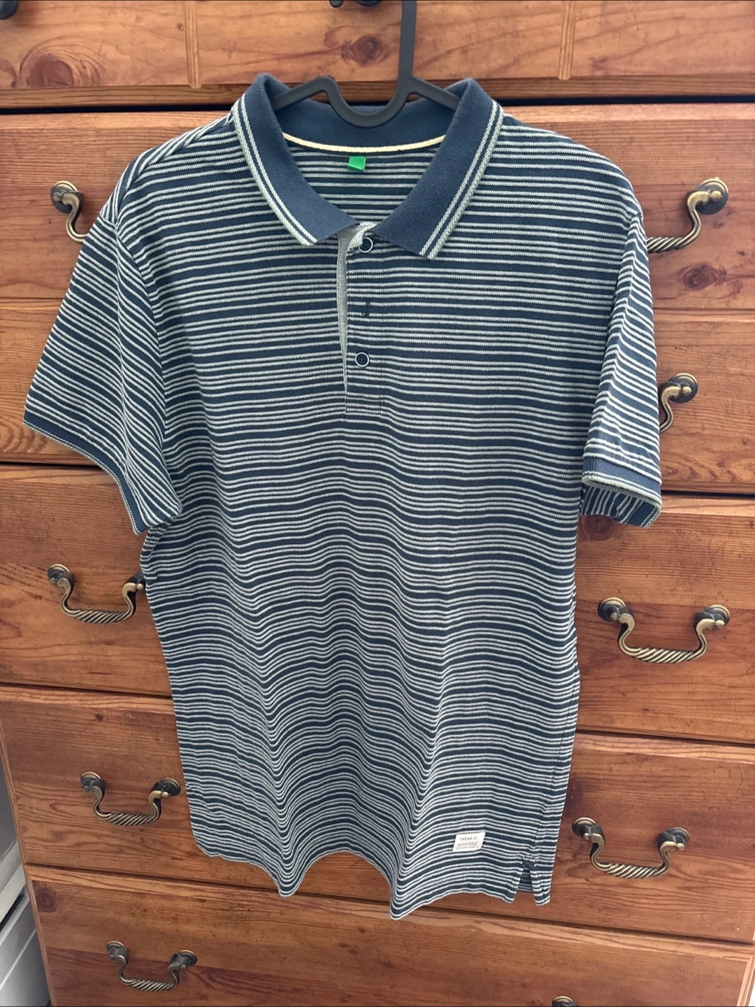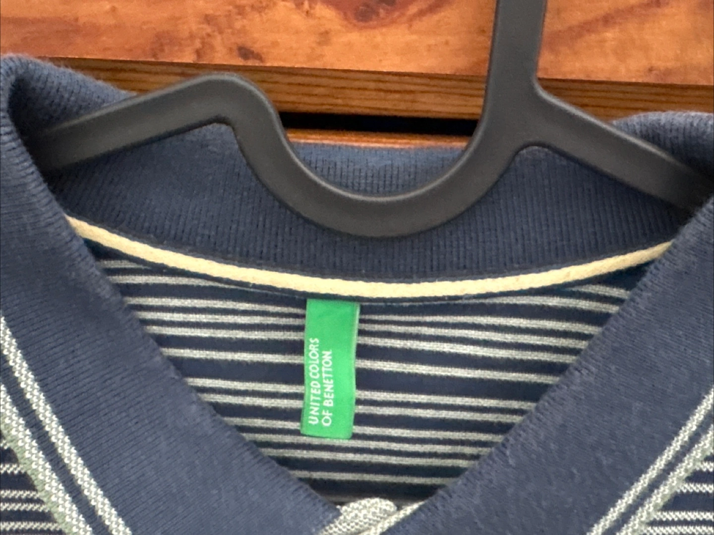 Here's a United Colors of Benetton polo shirt with a cool striped pattern! It's in great shape and ready for a new home. Perfect for casual wear or dressing up a bit